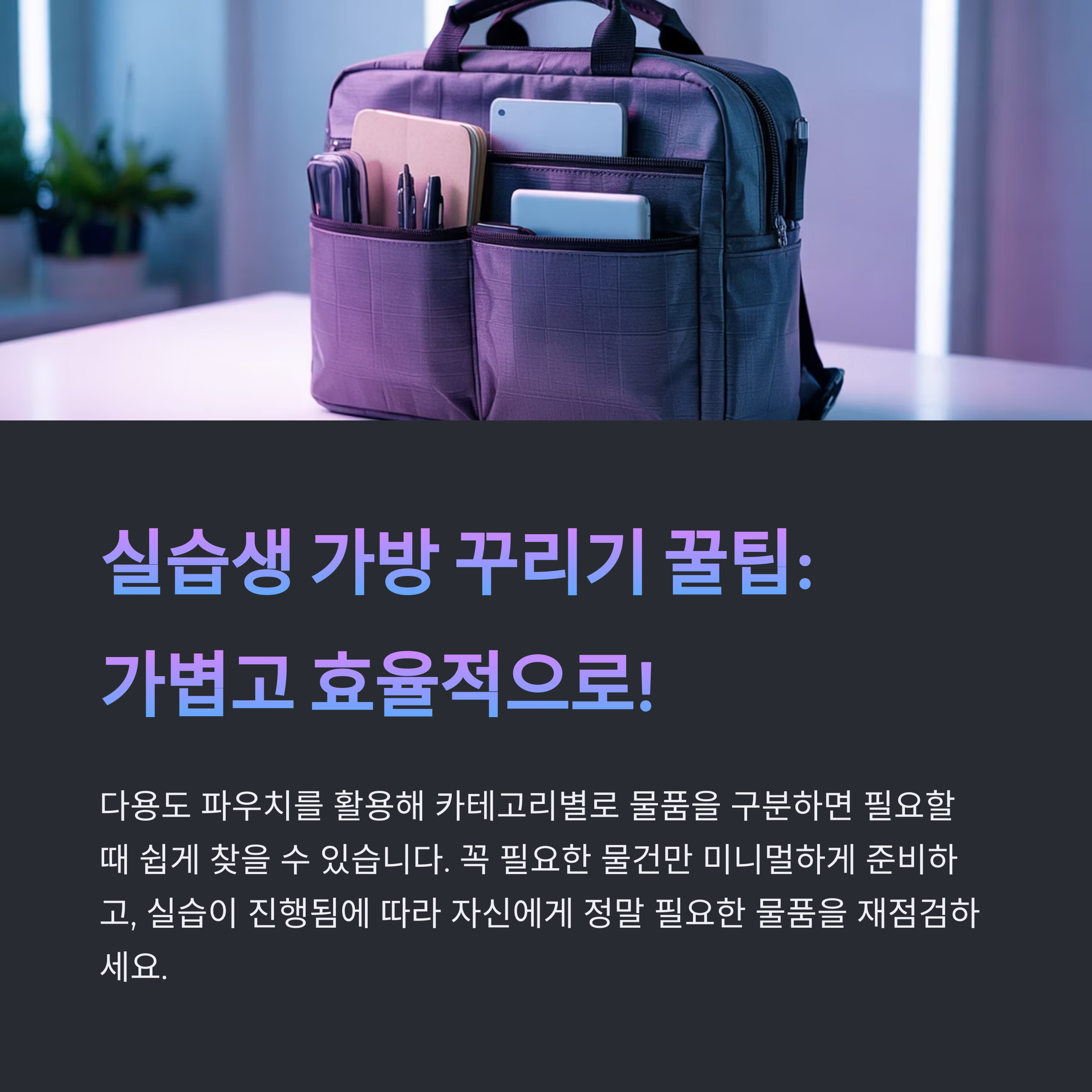"가벼운 가방이 실습 내내 여러분의 체력을 지켜줍니다!" 💼