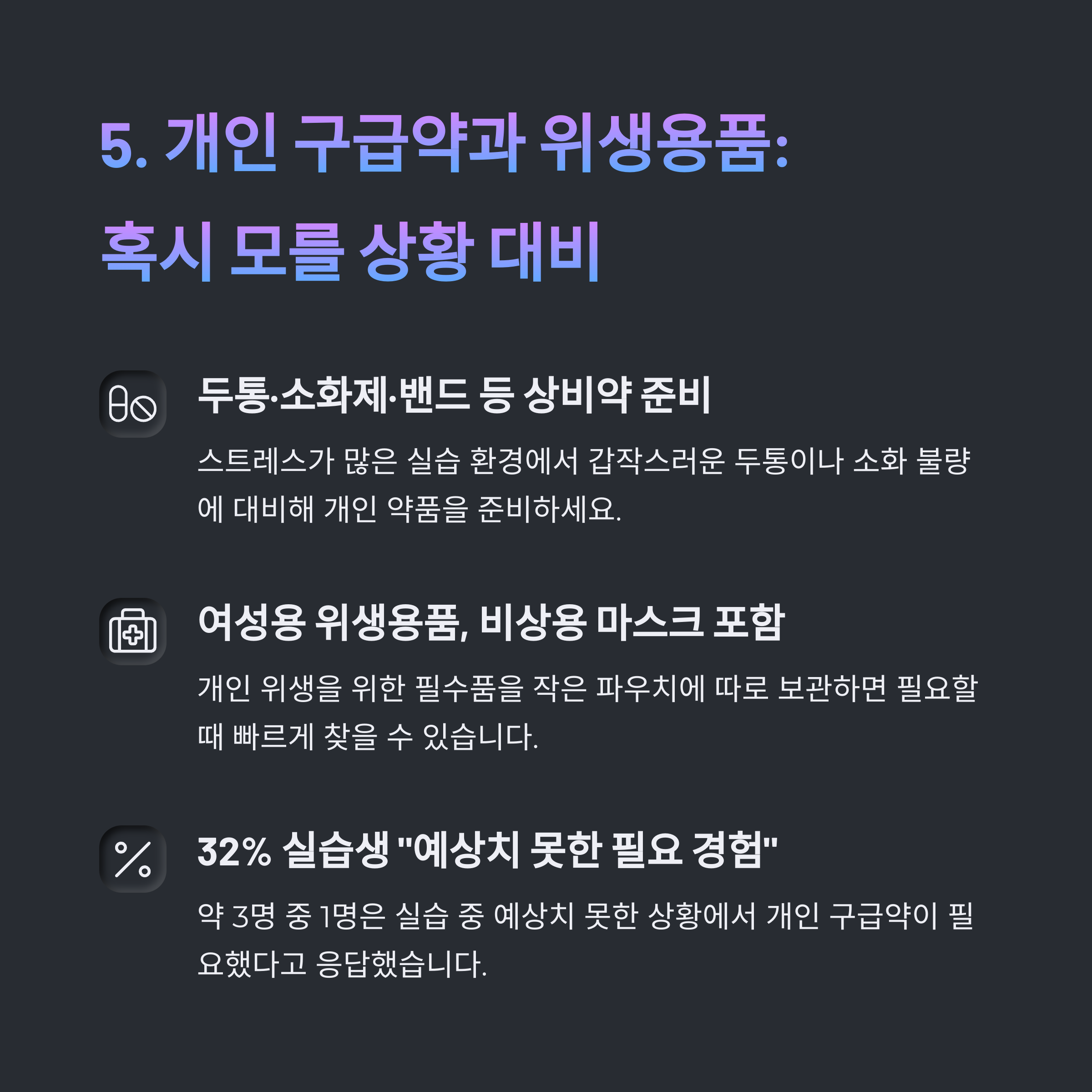 두통약, 밴드, 여성 위생용품 등 개인 구급약품을 준비하면 불안함이 줄어듭니다.