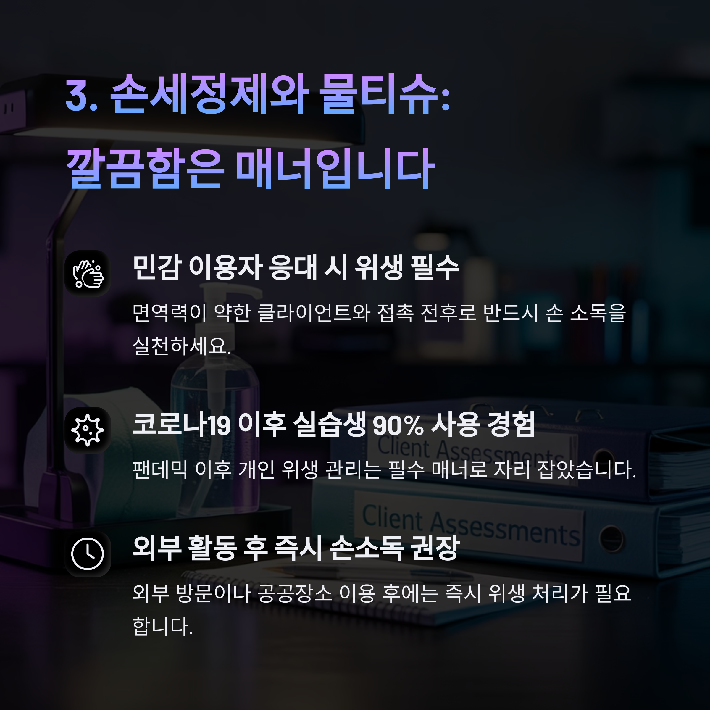 손세정제와 물티슈 - 깔끔함은 매너입니다