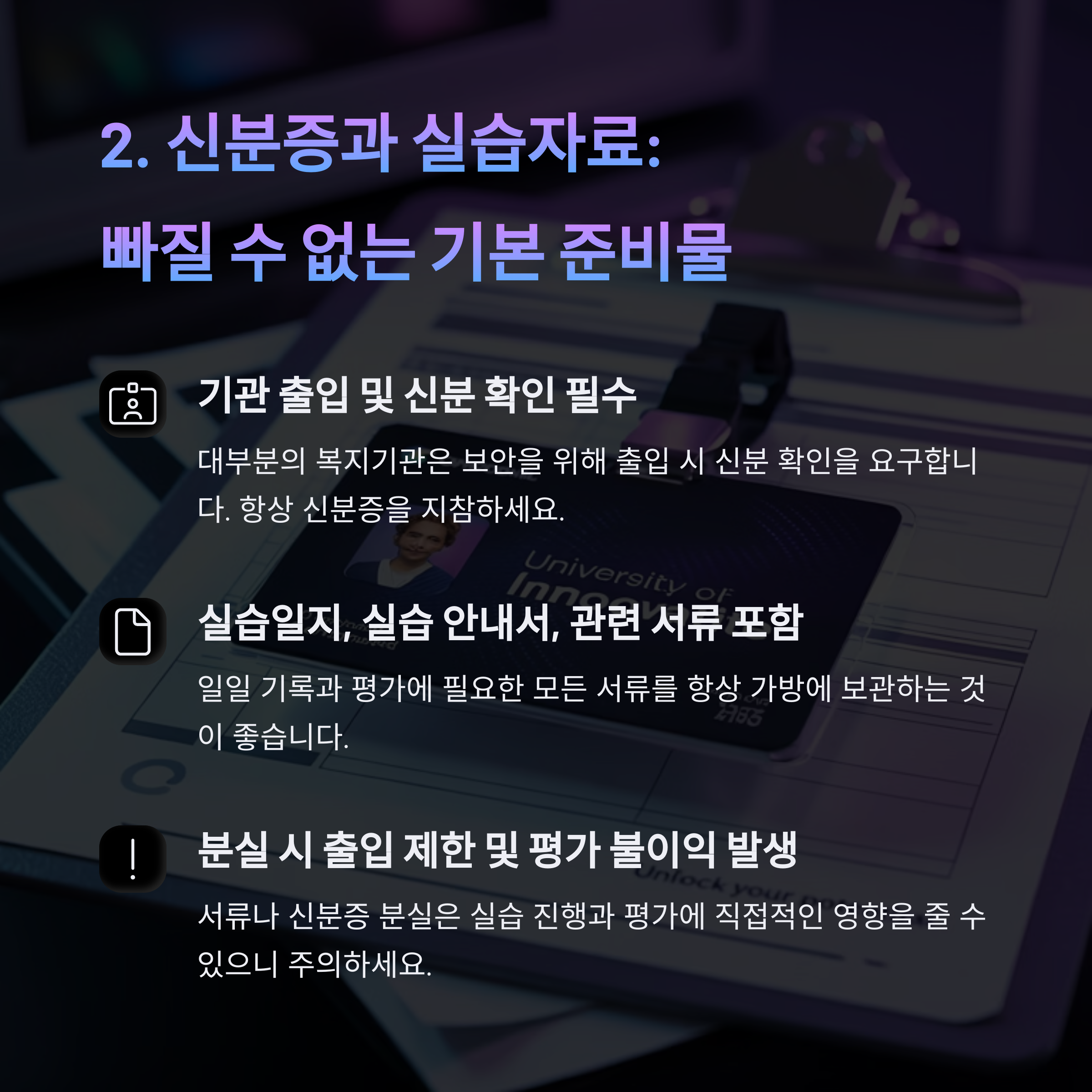 또한, 실습일지나 기관에서 제공한 자료집도 항상 가방에 넣어두세요.