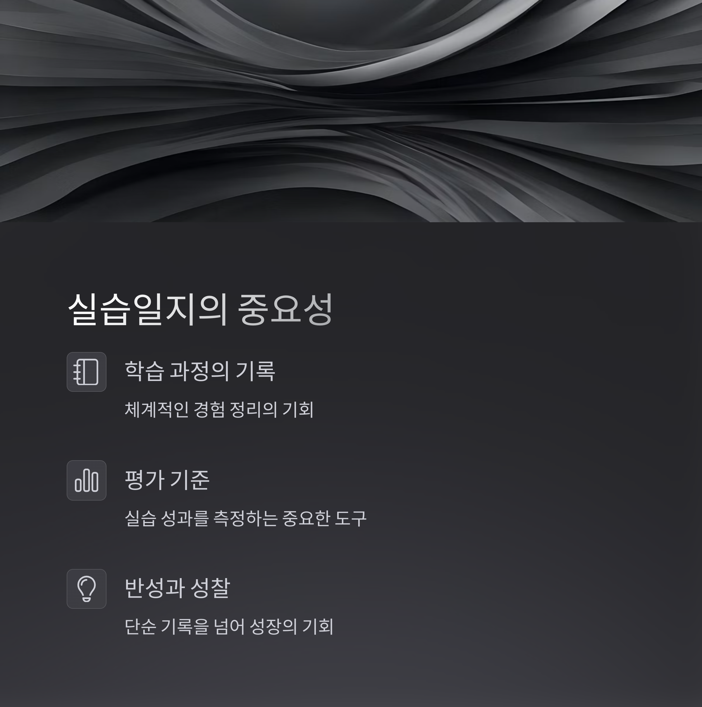 실습일지는 학습 과정의 기록이자 평가 기준이 됩니다.