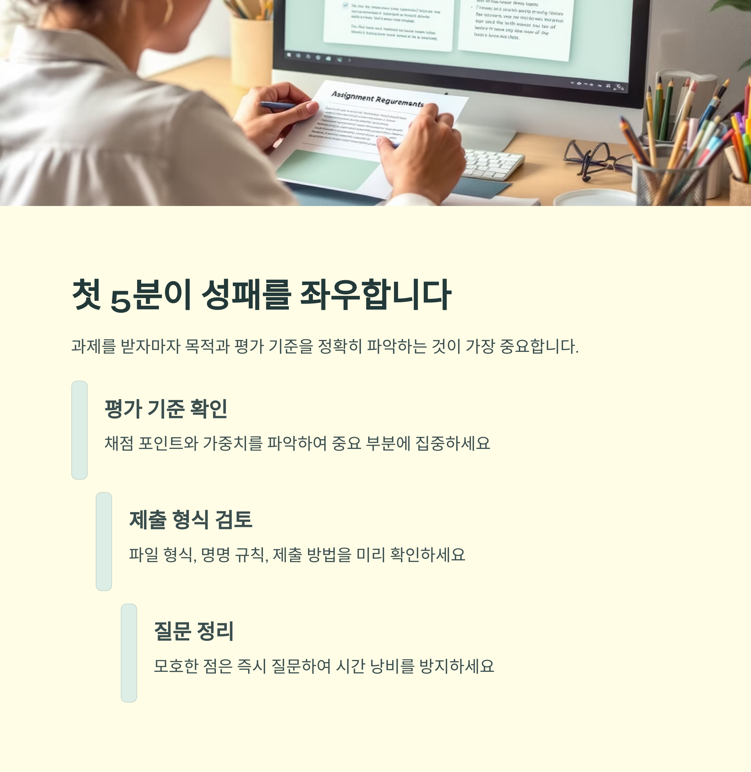 과제를 받자마자 가장 먼저 해야 할 일은 전체 목적과 평가 기준을 정확히 파악하는 것입니다.