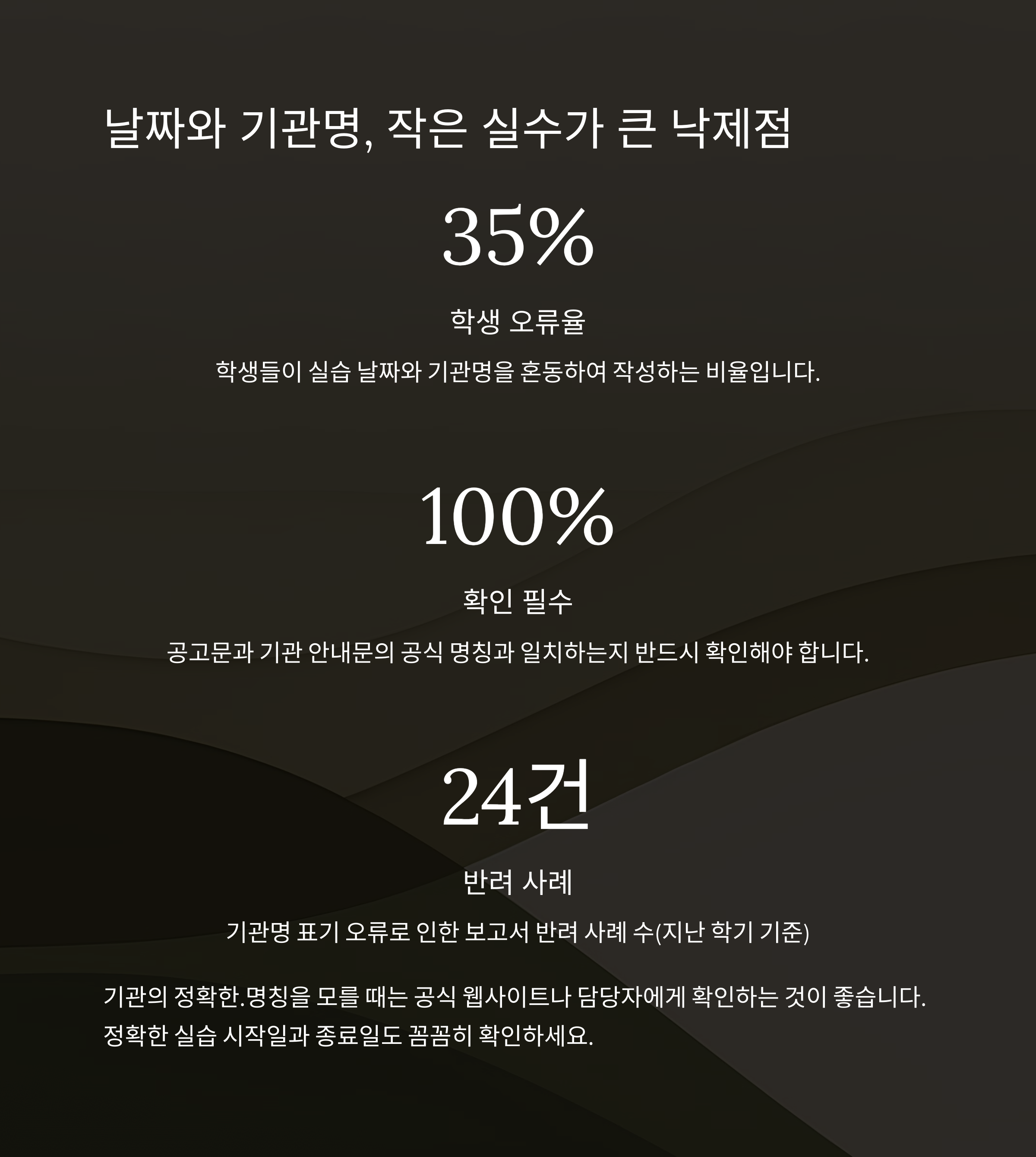 의외로 많은 실습생이 날짜 오기나 기관명 철자 오류를 범합니다.