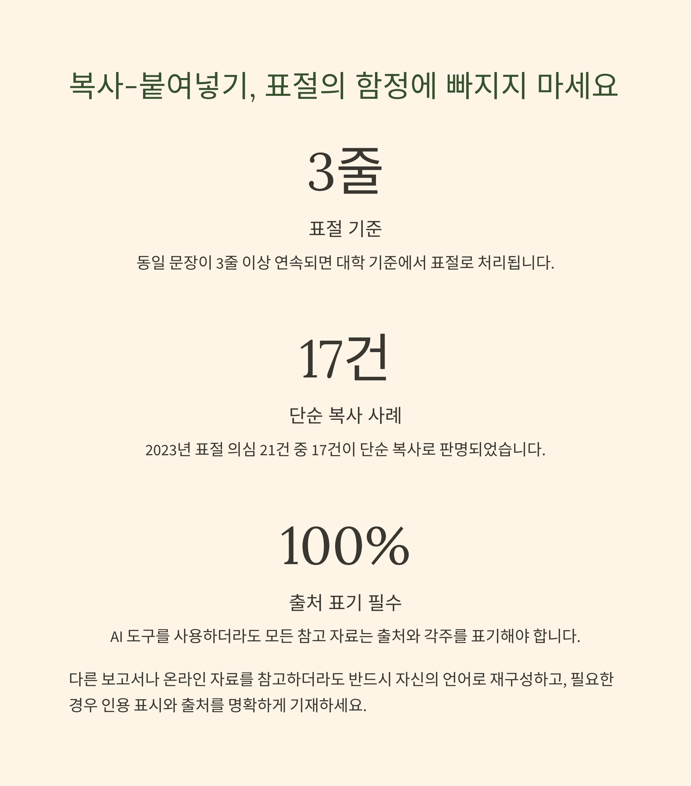 출처를 명확히 밝히고, 그대로 복사하는 일이 없도록 하세요.