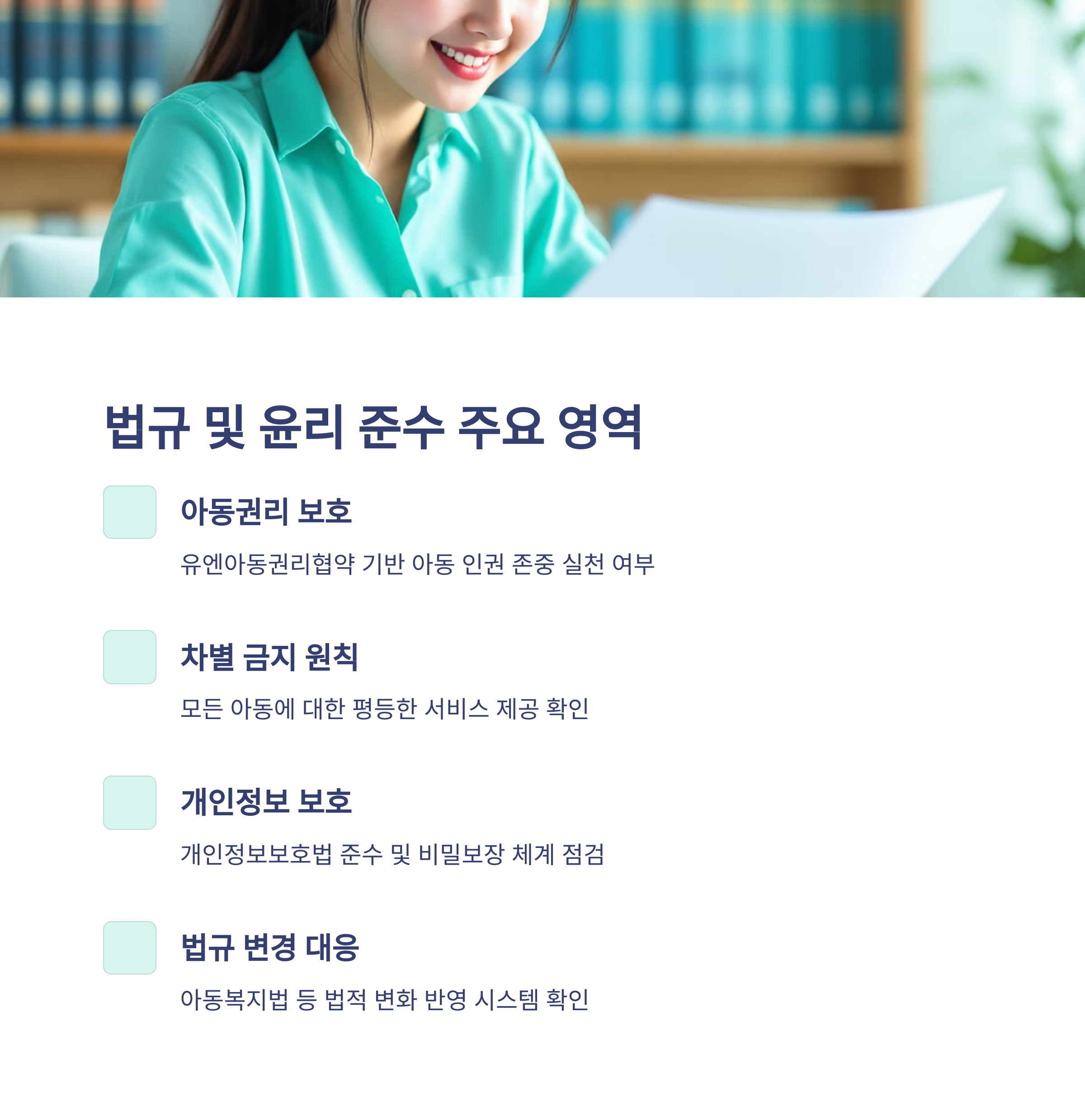 아동복지법 등 관련 법규를 철저히 준수하는지 평가합니다.