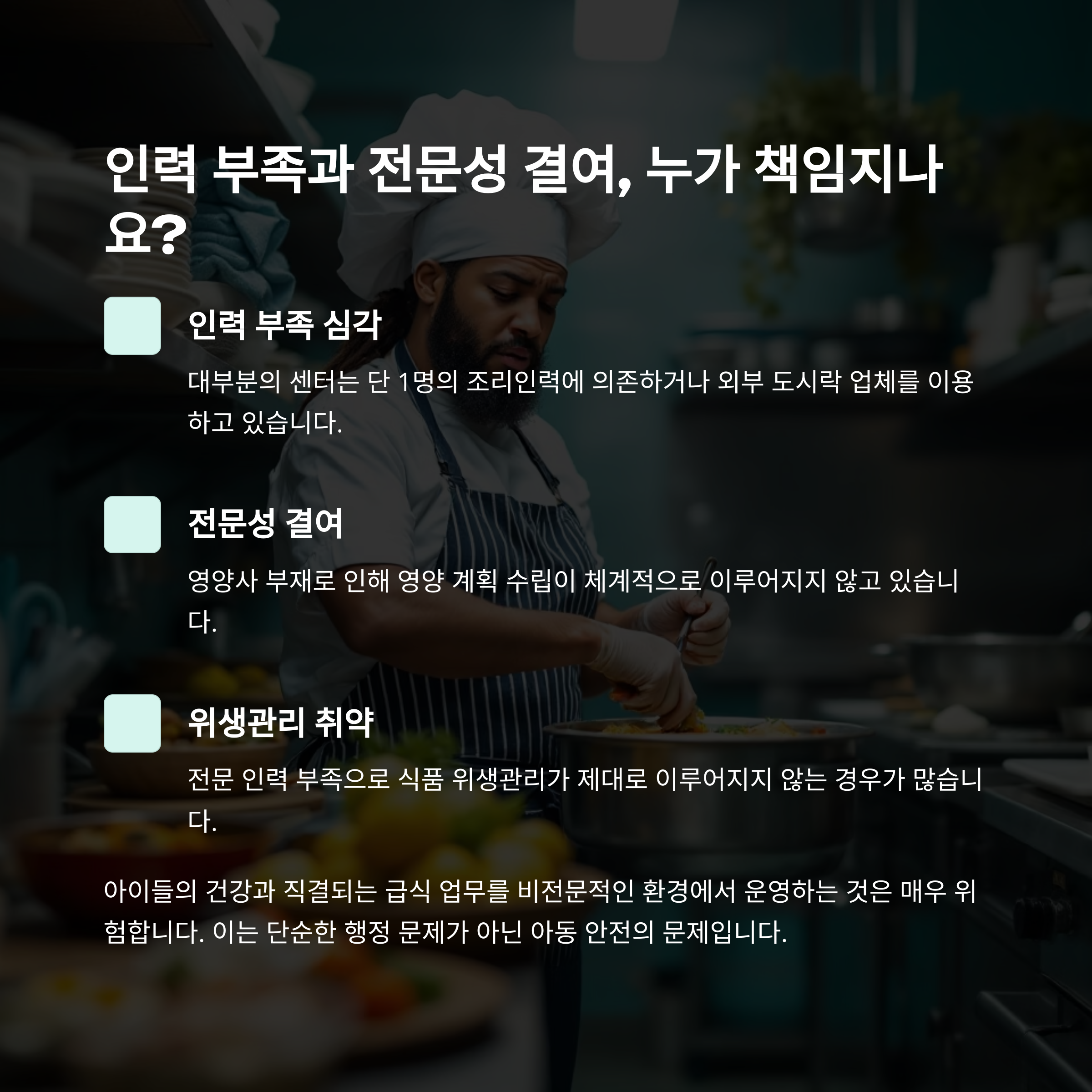 급식을 담당하는 인력의 전문성도 문제로 지적됩니다.