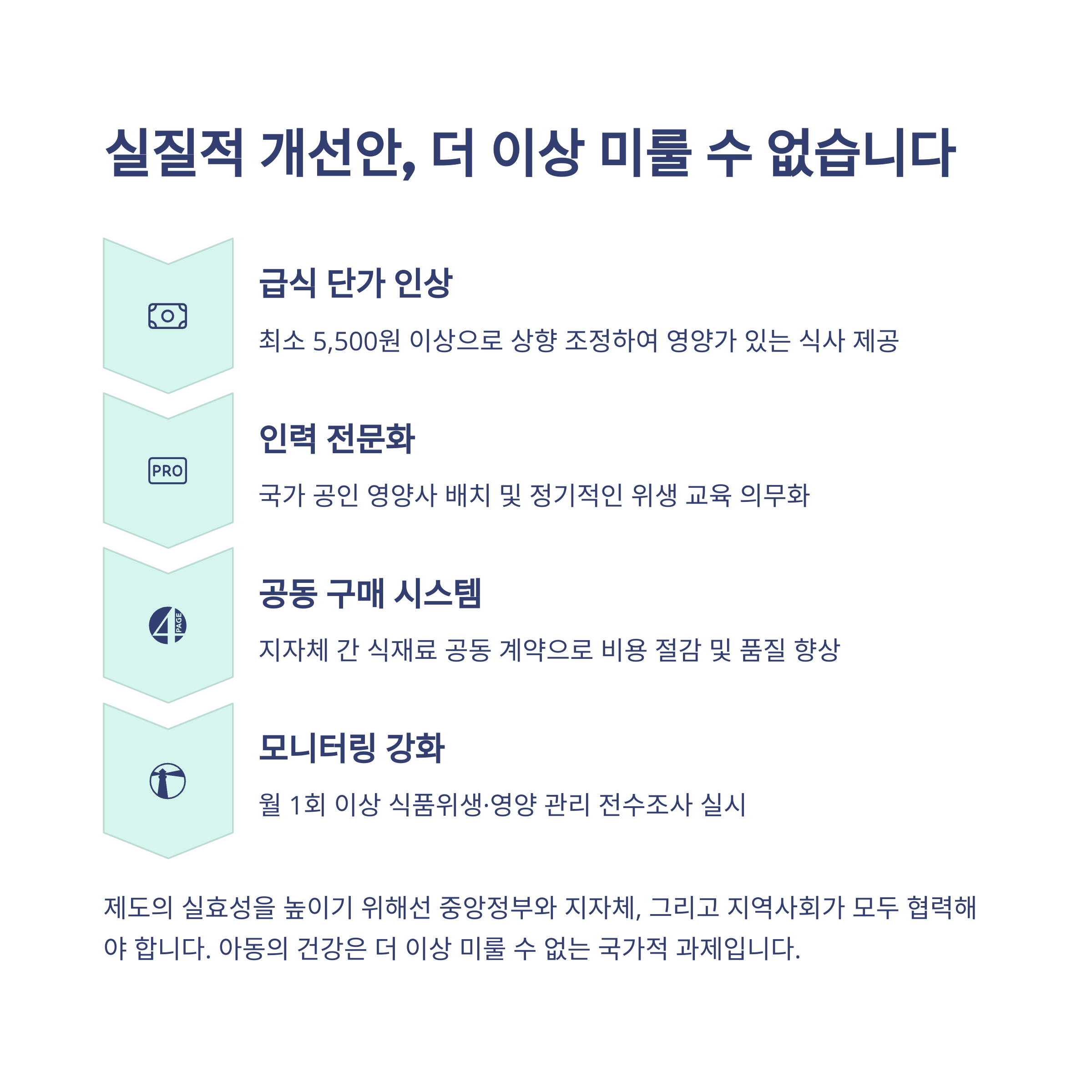 | 조리 인력 전문화 | 국가 공인 영양사 배치 및 위생 교육 의무화 |