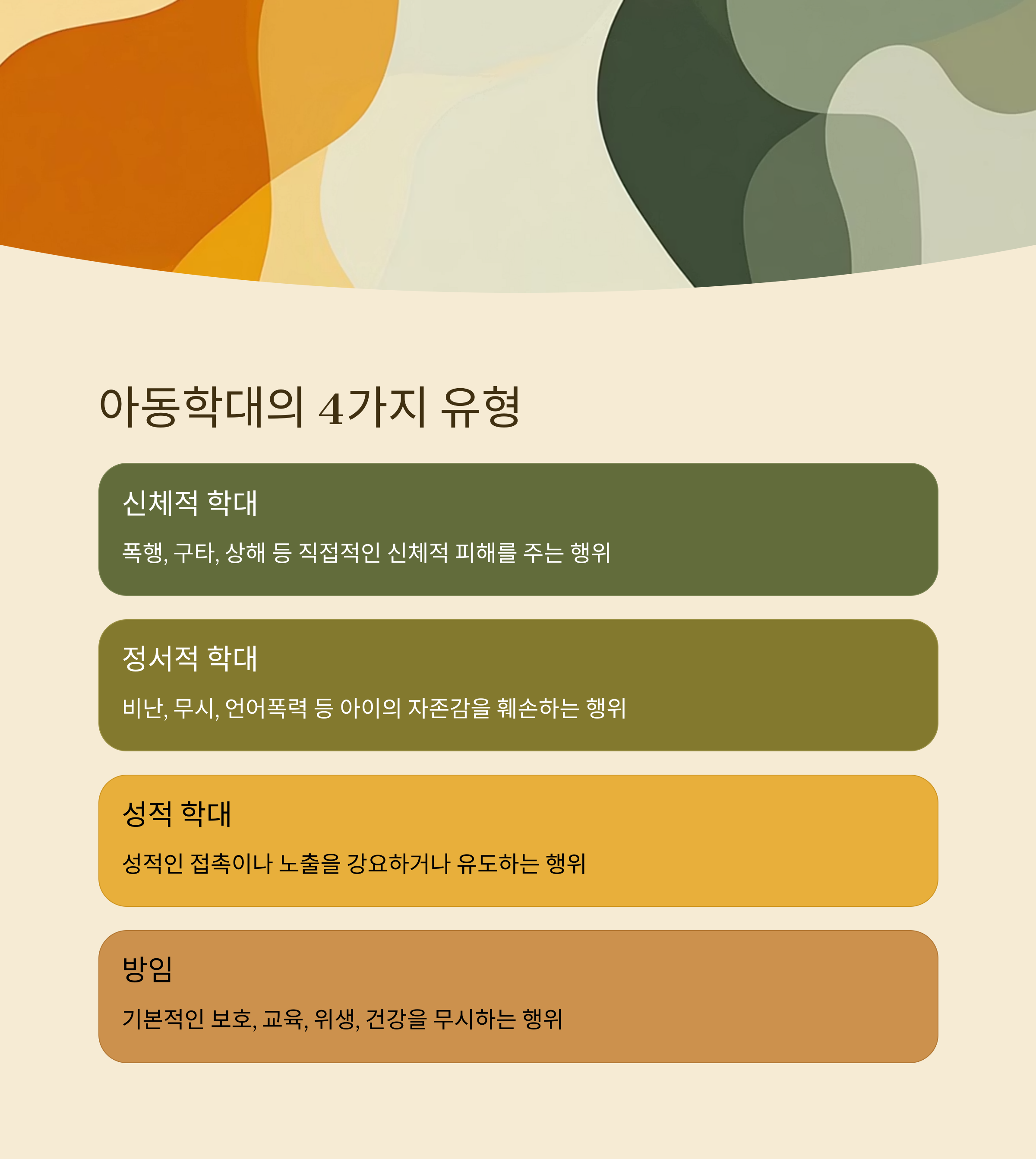 아동학대는 단순한 체벌이나 훈육이 아닌, 신체적·정서적·성적·방임적 폭력을 포함합니다