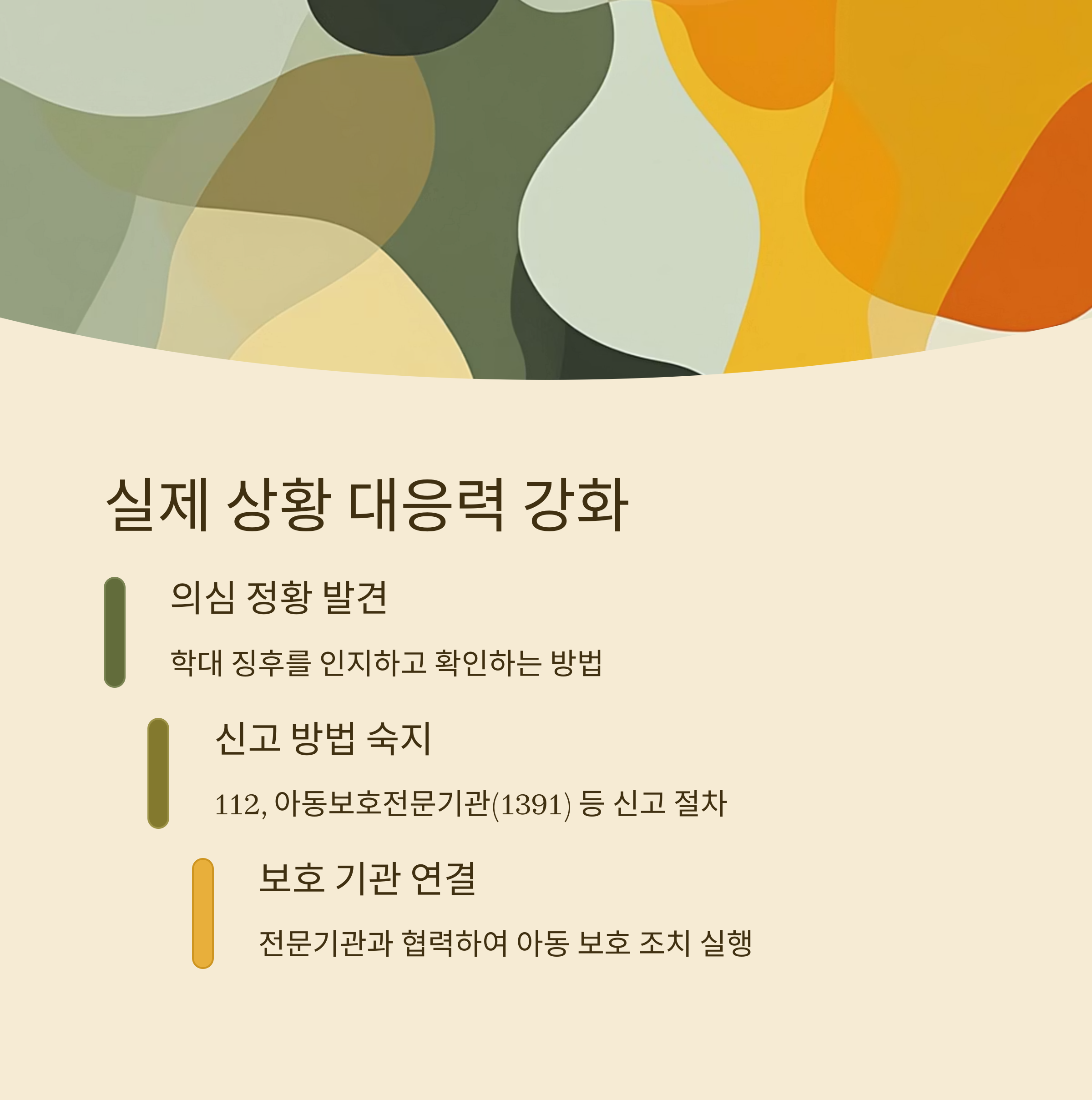 예를 들어, 의심 정황 발견 시 대응 절차, 신고 방법, 보호 기관 연결 방식 등을 실제 시나리오로 훈련합니다.