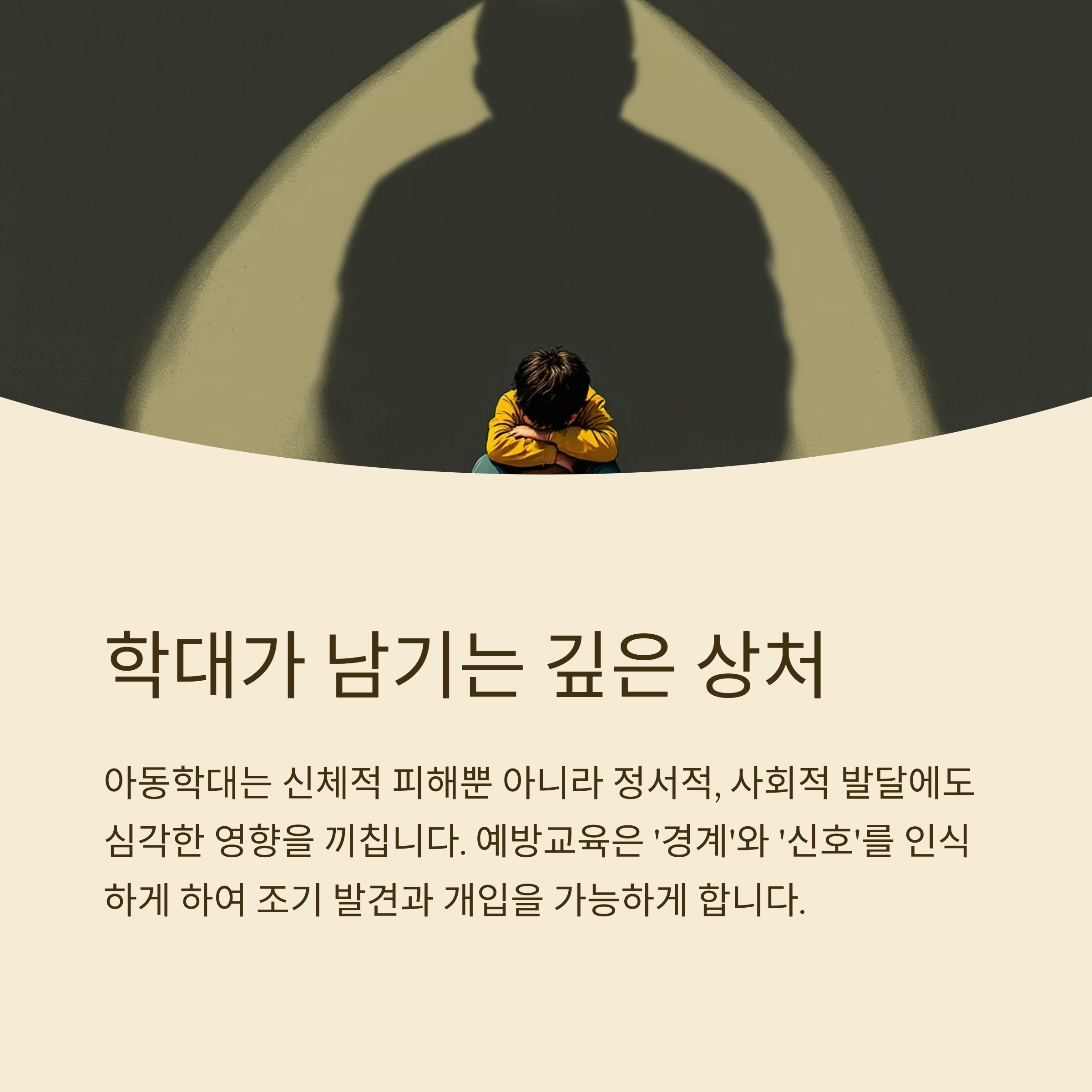 예방교육은 학대 상황을 빠르게 감지하고, 즉각적으로 대응할 수 있는 사회적 시스템의 기초가 됩니다.