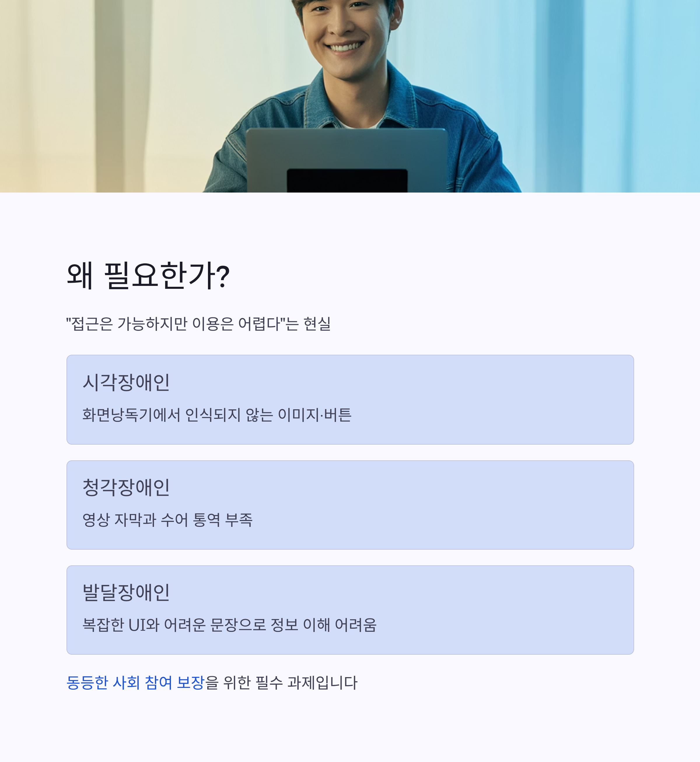 • 발달장애인: 복잡한 UI와 어려운 문장으로 정보 이해 어려움