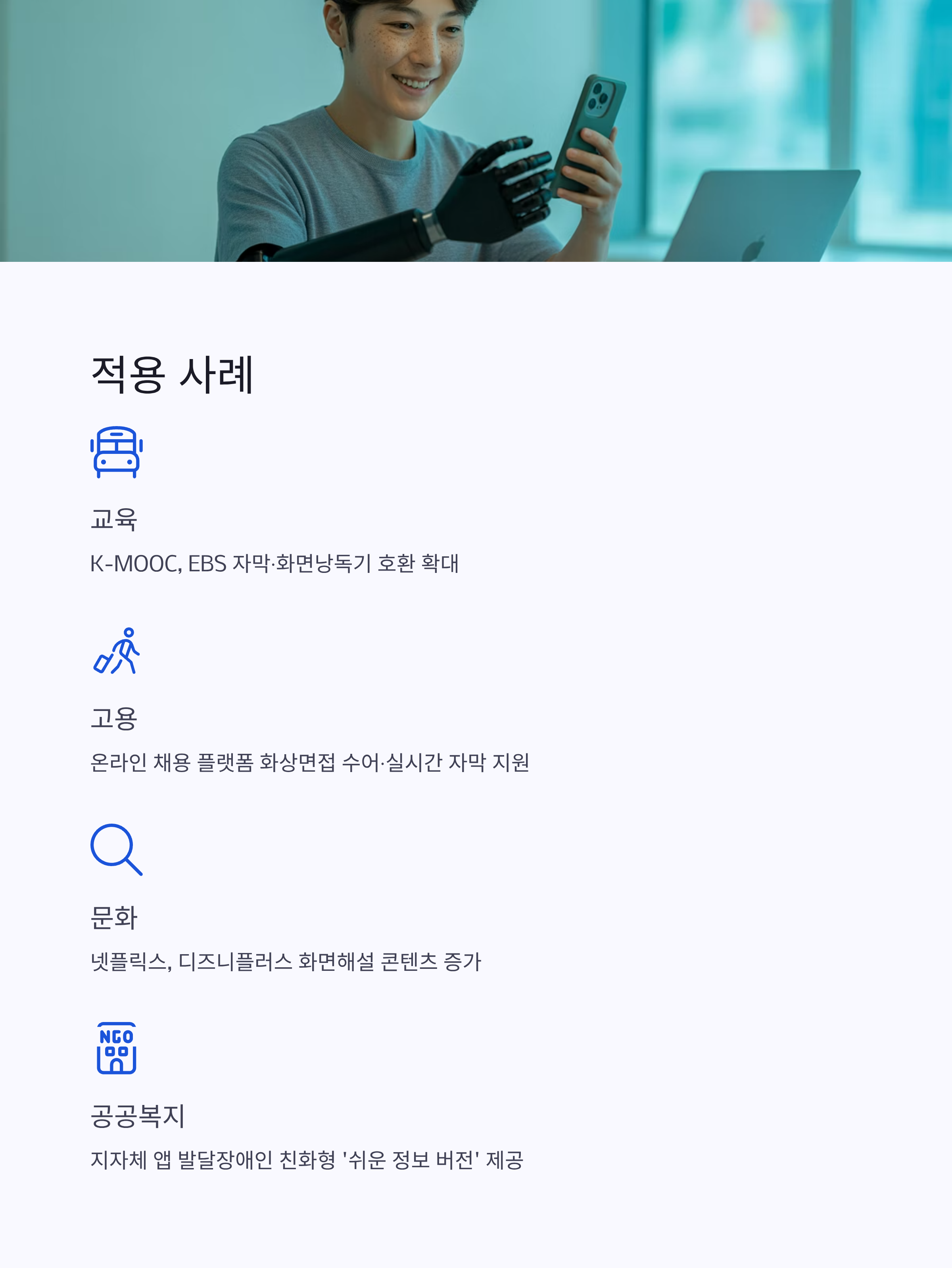 • 고용: 온라인 채용 플랫폼에서 화상면접 시 수어·실시간 자막 지원