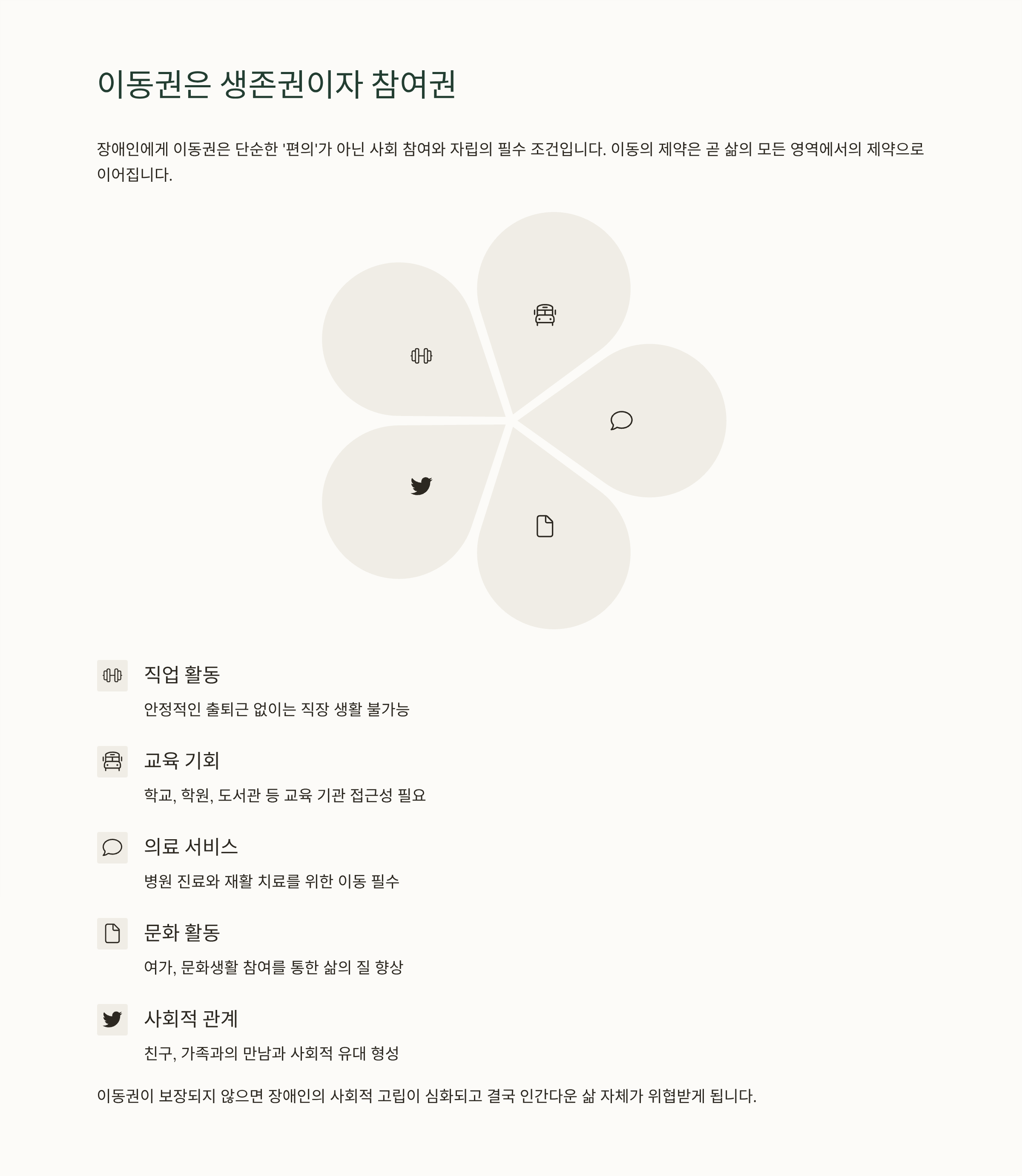 이동권이 보장되어야 장애인은 직장, 교육, 문화생활 등 다양한 사회활동에