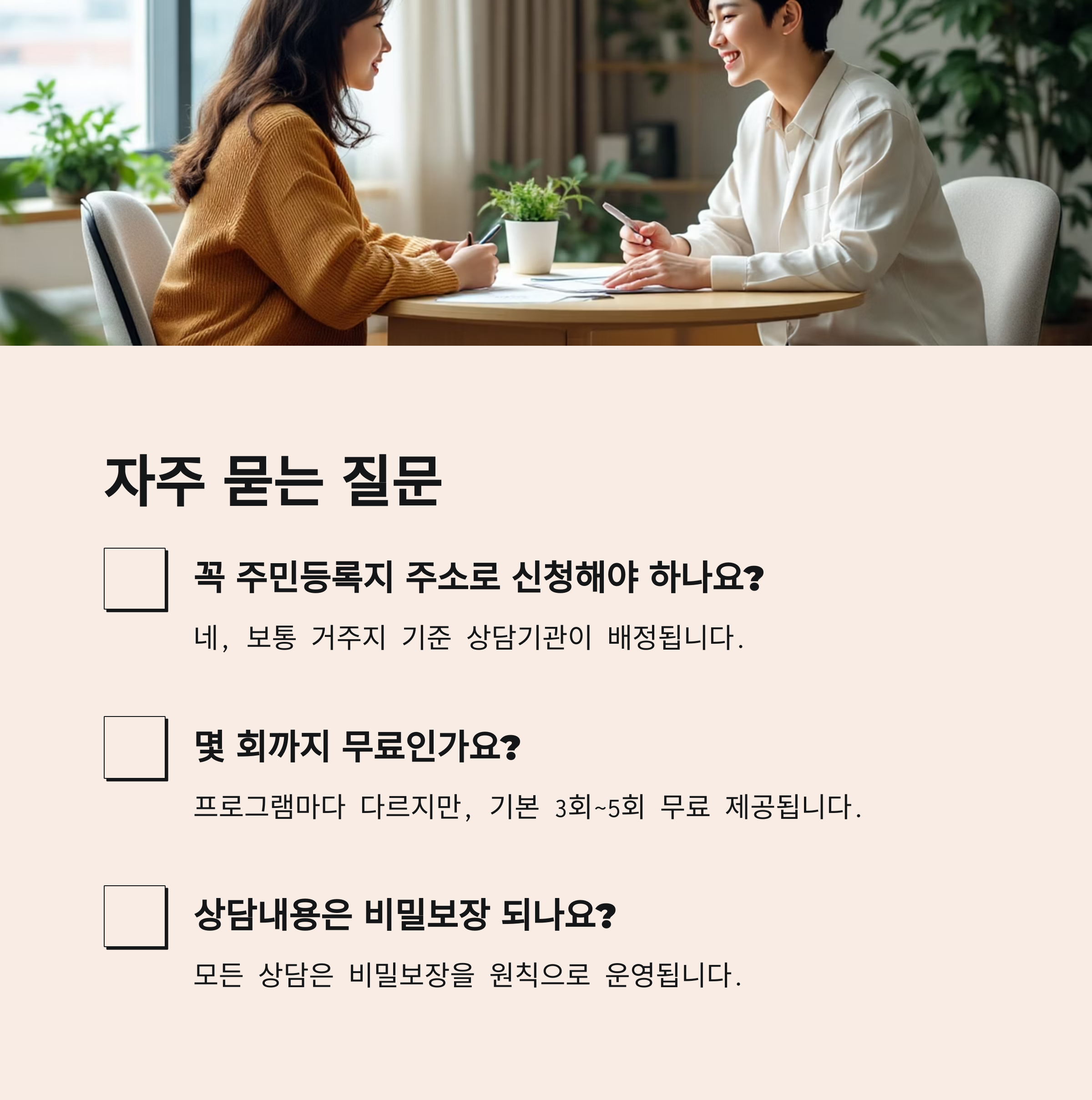 A: 프로그램마다 다르지만, 기본 3회~5회 무료 제공됩니다. - Q: 상담내용은 비밀 보장되나요?