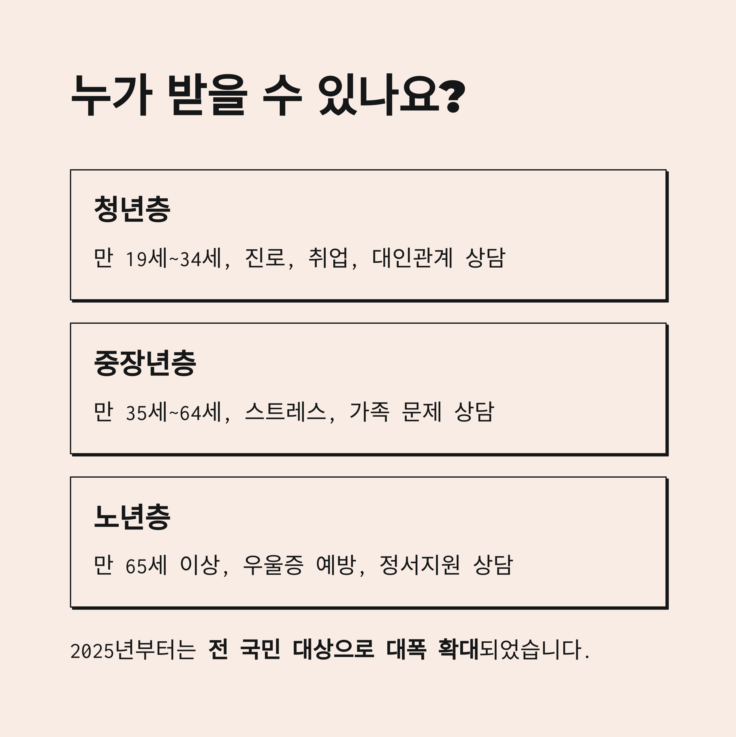 | 청년층 | 만 19세~34세 | 진로, 취업, 대인관계 상담 |