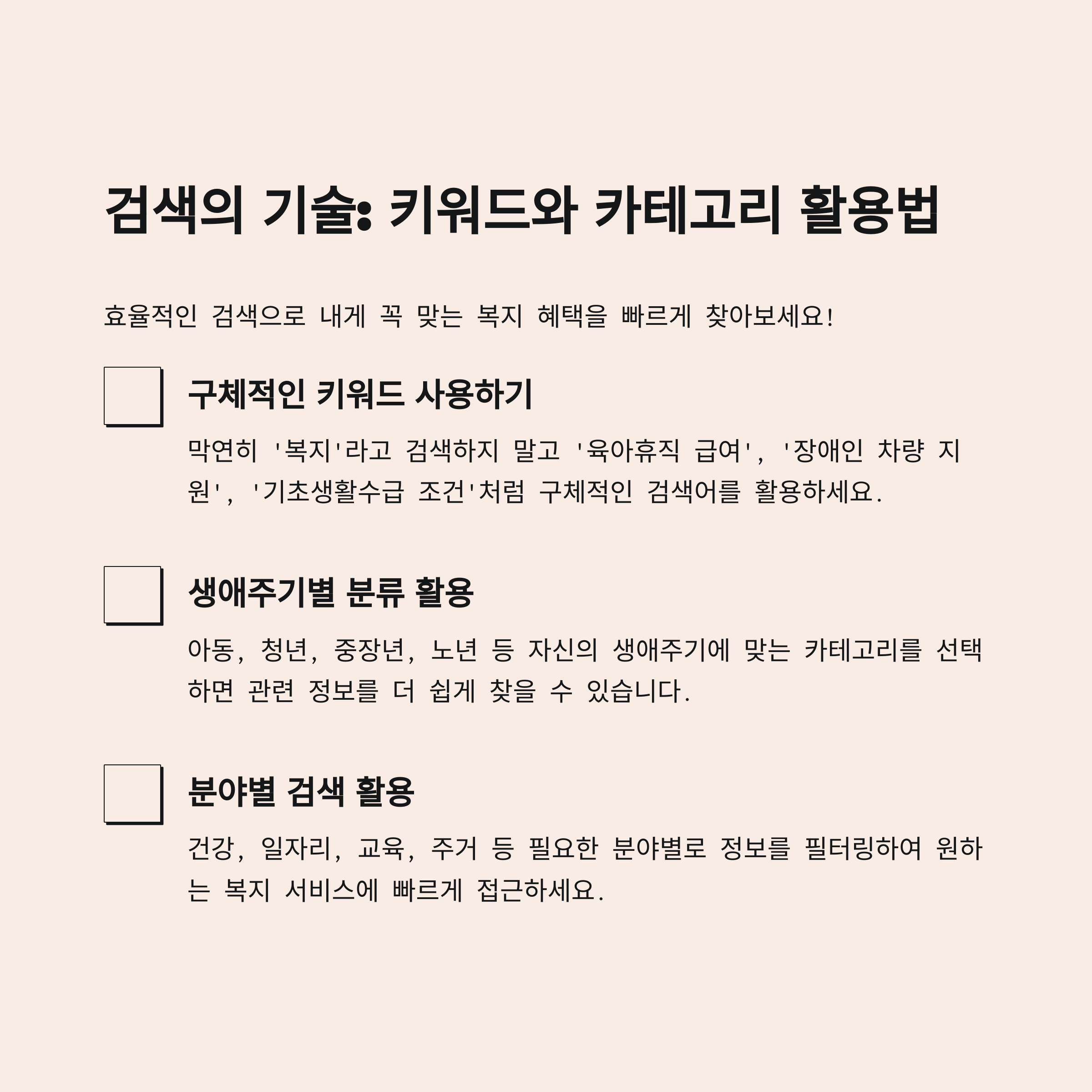 막연히 ‘복지’라고 검색하기보다는 구체적인 키워드 사용이 효과적입니다.