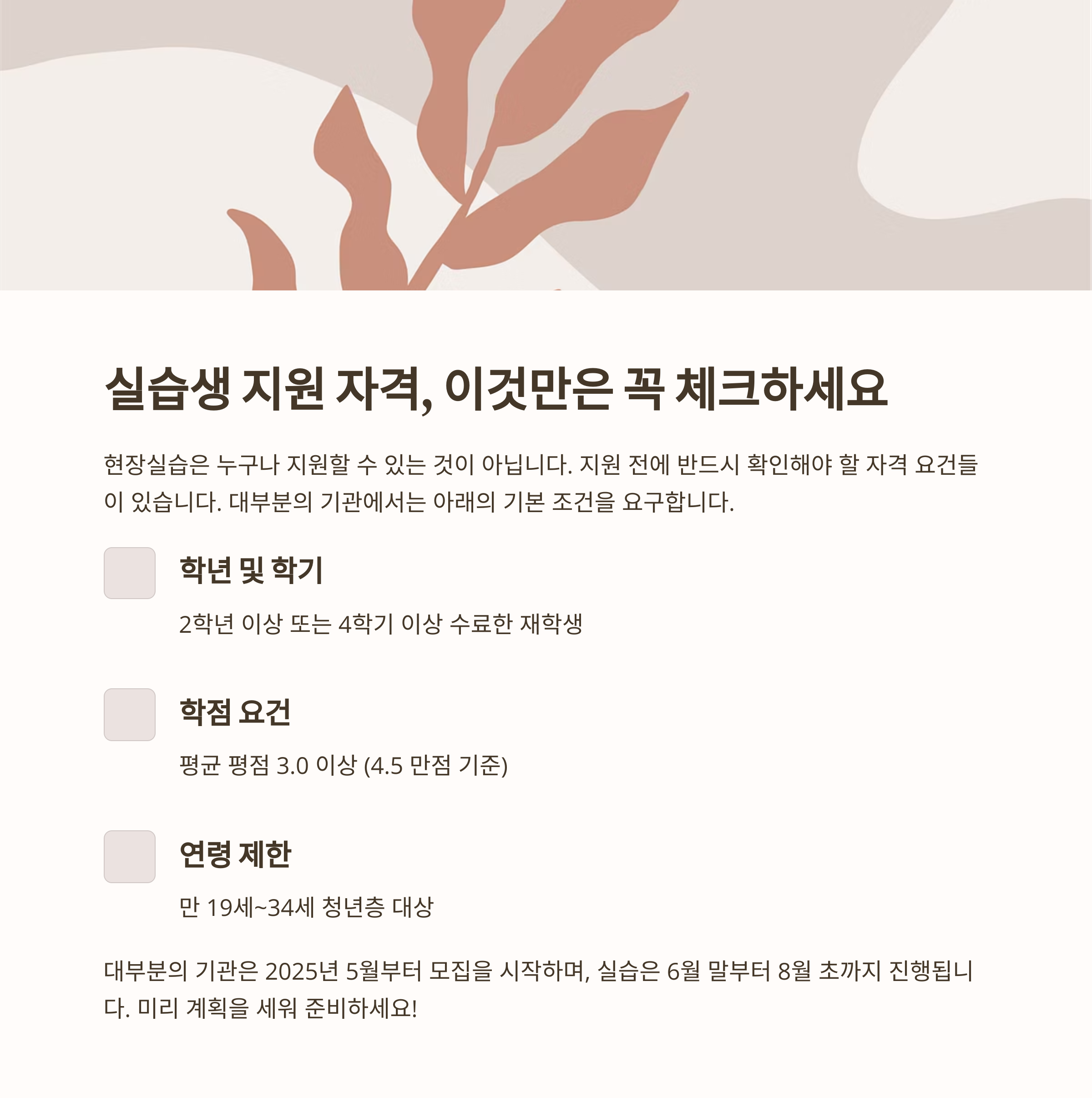 실습생 지원 자격은 비교적 명확하게 정리되어 있습니다.
