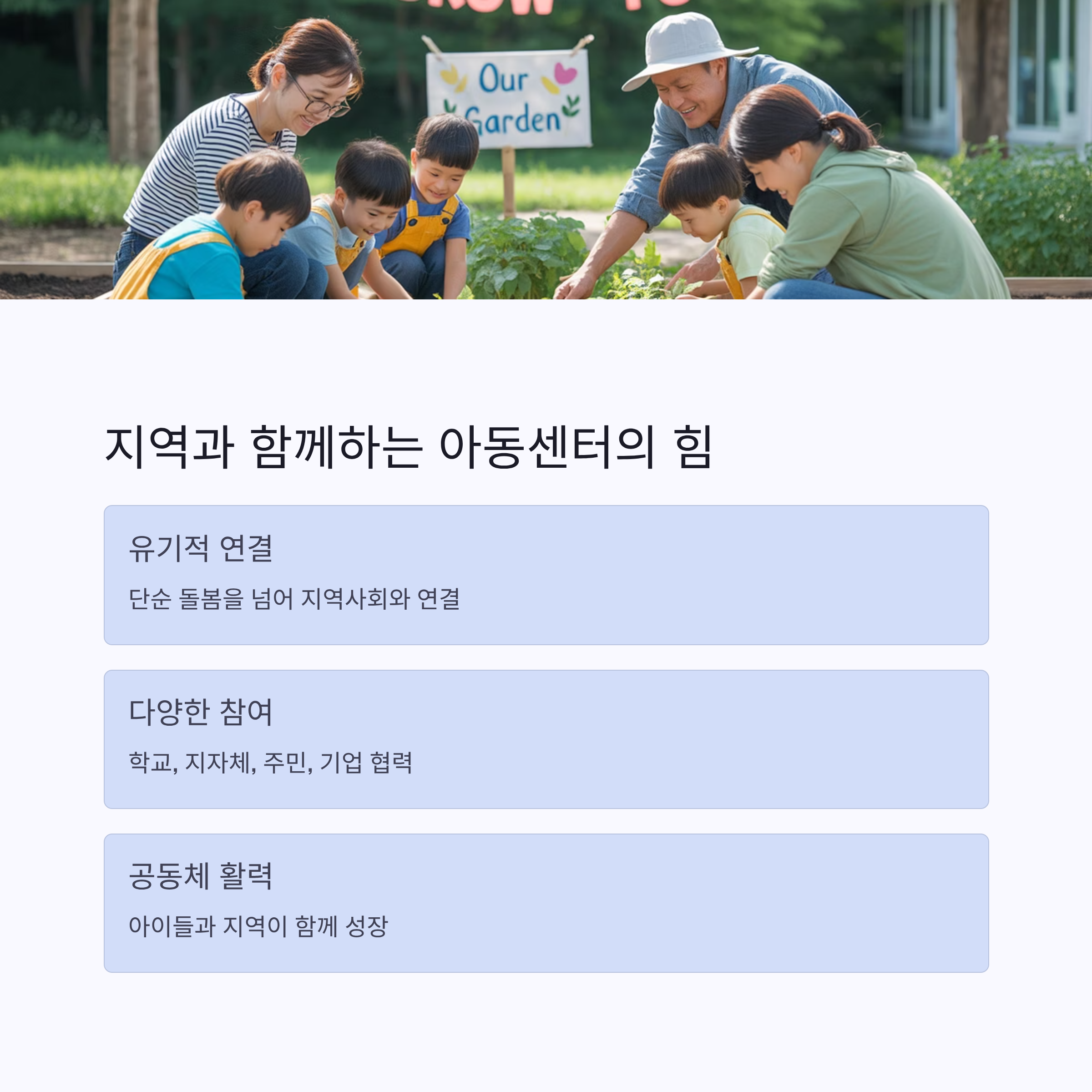 지역사회와 손잡은 아동센터는 아이들에게 단순한 돌봄을 넘어, 배움과 성장, 사회성을 길러주는 공간으로 확장돼요. 동시에 지역은 아이들의 웃음으로 활력을 얻고, 다양한 세대가 교류하며 더 단단해지죠. 결국 아동센터와 지역사회는 따로가 아니라 함께 성장하는 존재라는 걸 보여주는 사례들이에요.