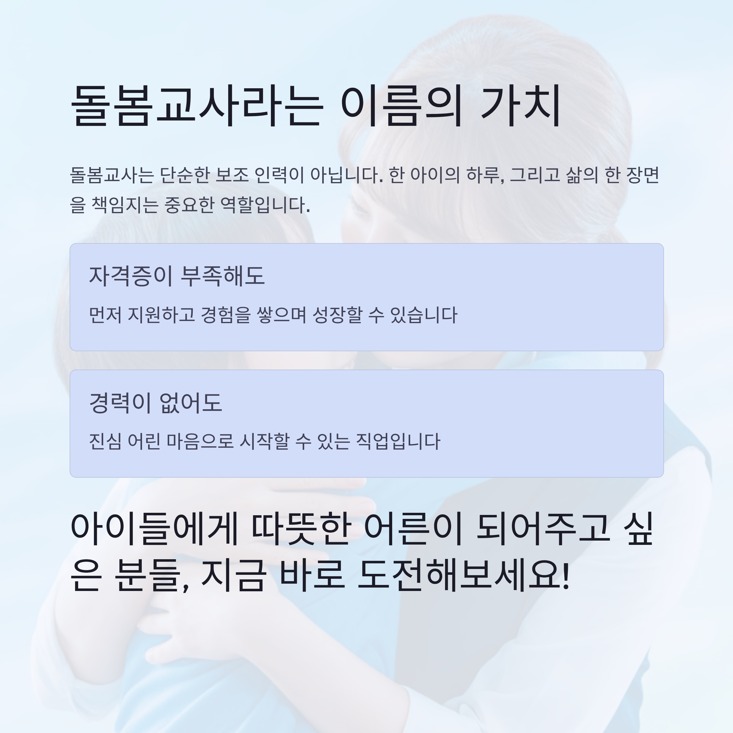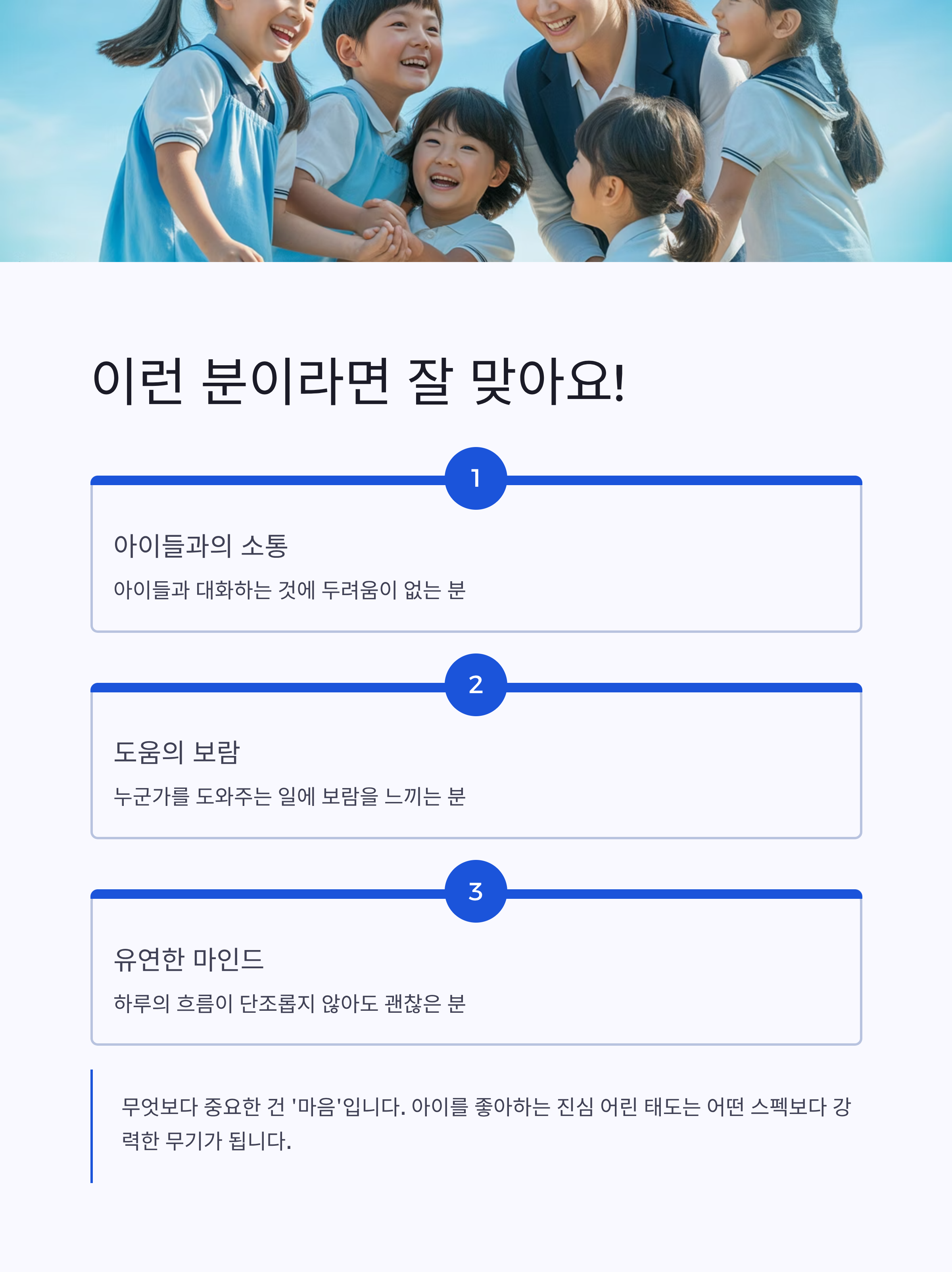 무엇보다 중요한 건 ‘마음’입니다. 아이를 좋아하는 진심 어린 태도는 어떤 스펙보다 강력한 무기가 되죠.