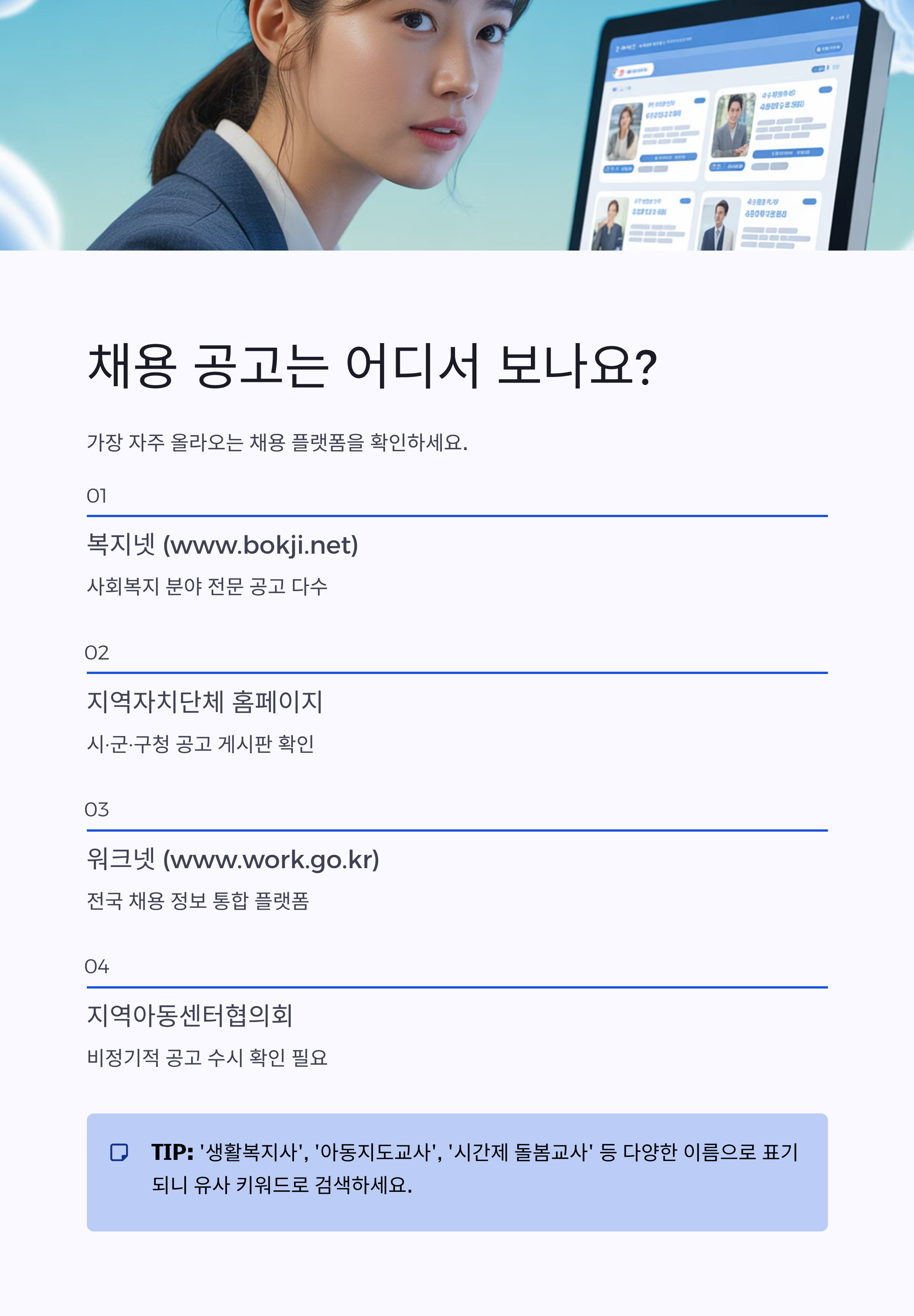 공고에 따라 ‘생활복지사’, ‘아동지도교사’, ‘시간제 돌봄 교사’ 등 다양한 이름으로 표기되기도 하니, 검색 시 유사 키워드로 함께 확인하세요.