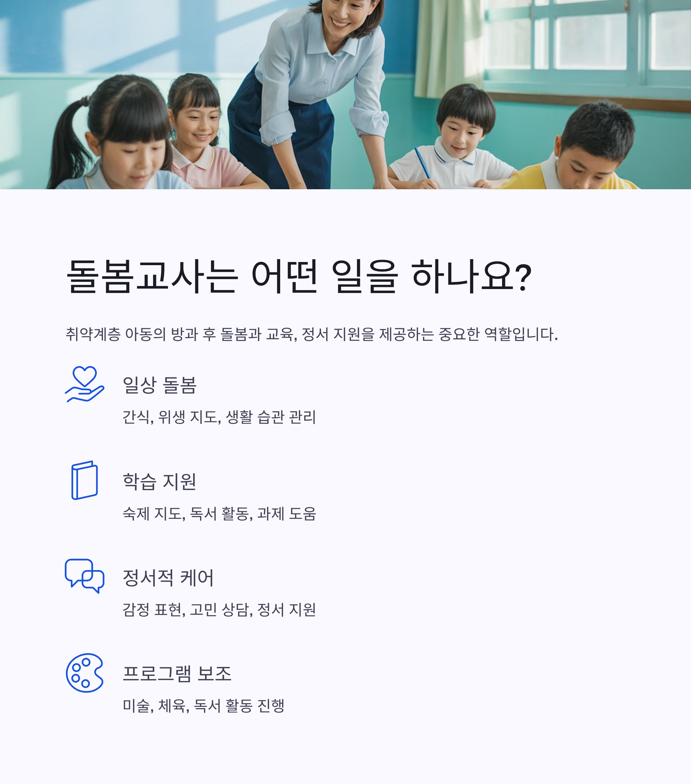 학습 지도, 생활 관리, 정서적 교감, 그리고 프로그램 운영까지 다양한 역할을 수행하죠.