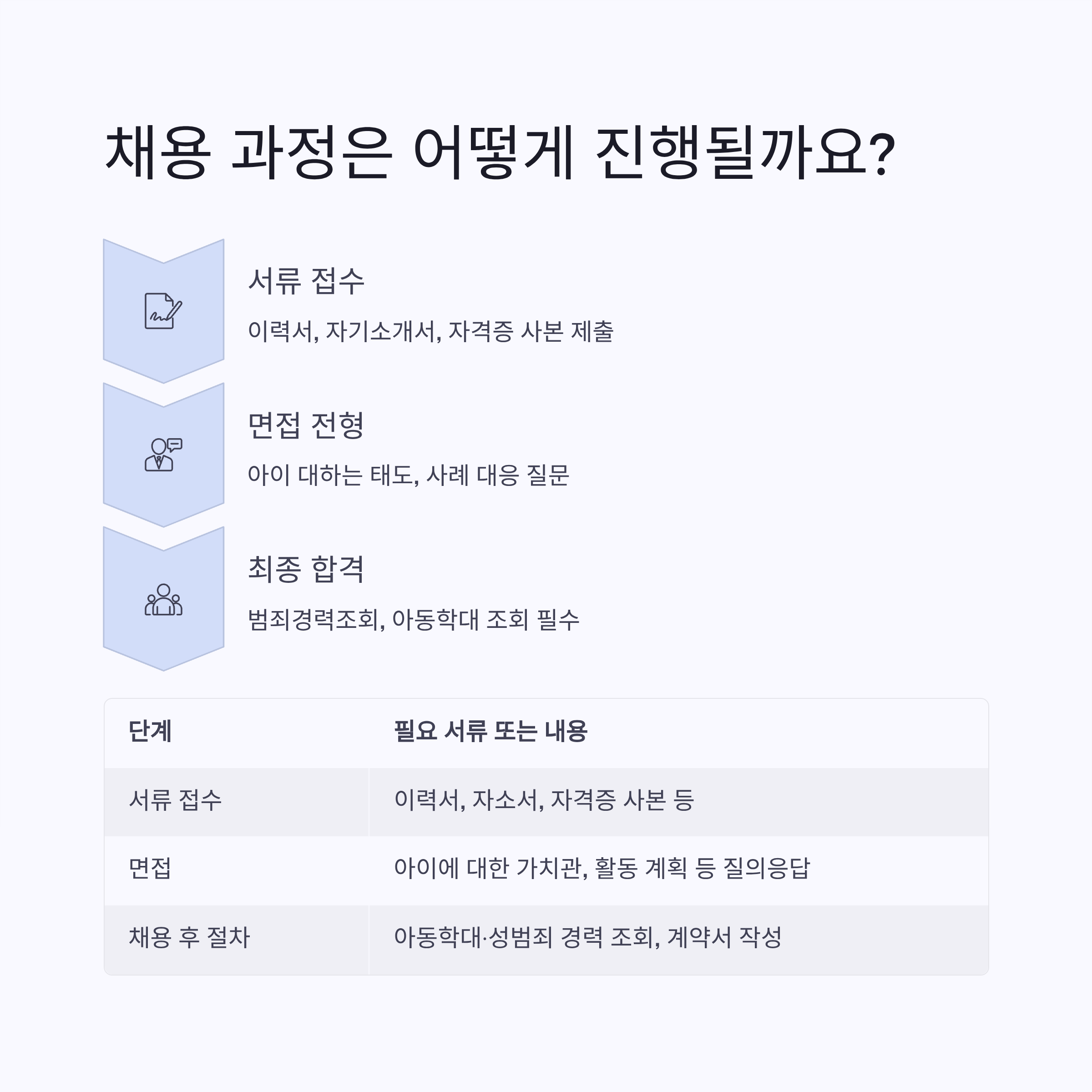 | 채용 후 절차 | 아동학대·성범죄 경력 조회, 계약서 작성 등 |