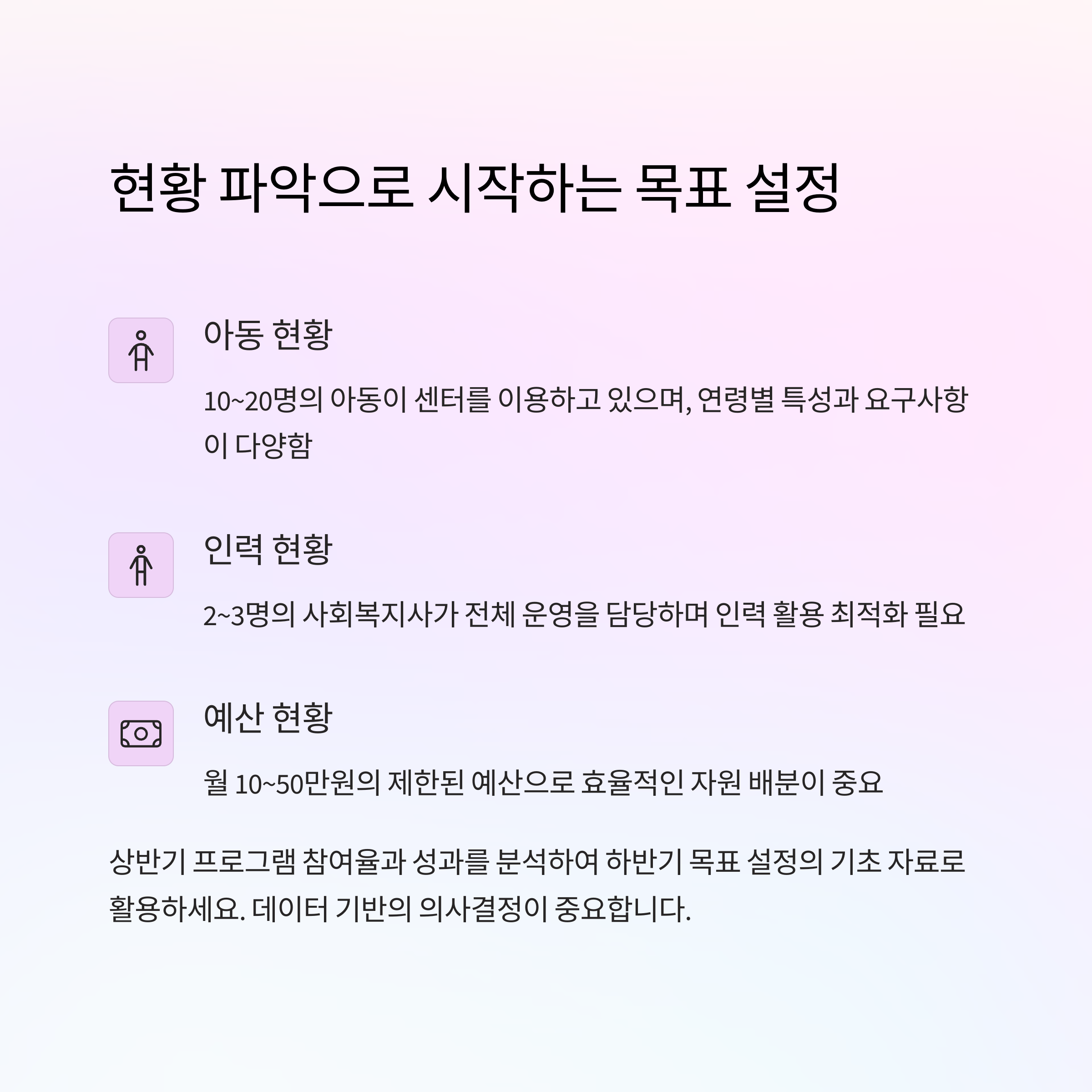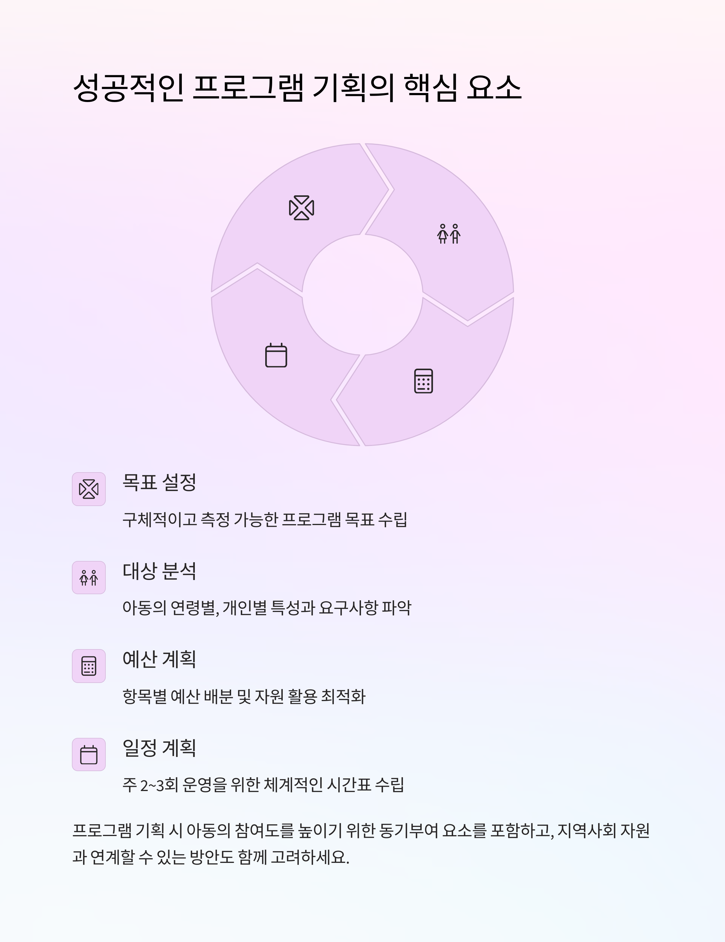 | 주간회의에서는 주요 프로그램의 진행상황과 개선점을 논의하는 것이 필수적입니다. 운영 프로그램의 성과평가를 통해 향후 개선 방향을 정하는 것이 중요합니다. 아동 만족도 조사를 기반으로 보호자와 효과적인 피드백 루트를 만들어야 합니다. 예산은 프로그램 진행 여부를 결정하는 주요 항목으로 꼼꼼히 검토해야 합니다. 자원봉사자 관리와 실습생 모집 및 활용 방안도 중요한 요소로 고려됩니다. |