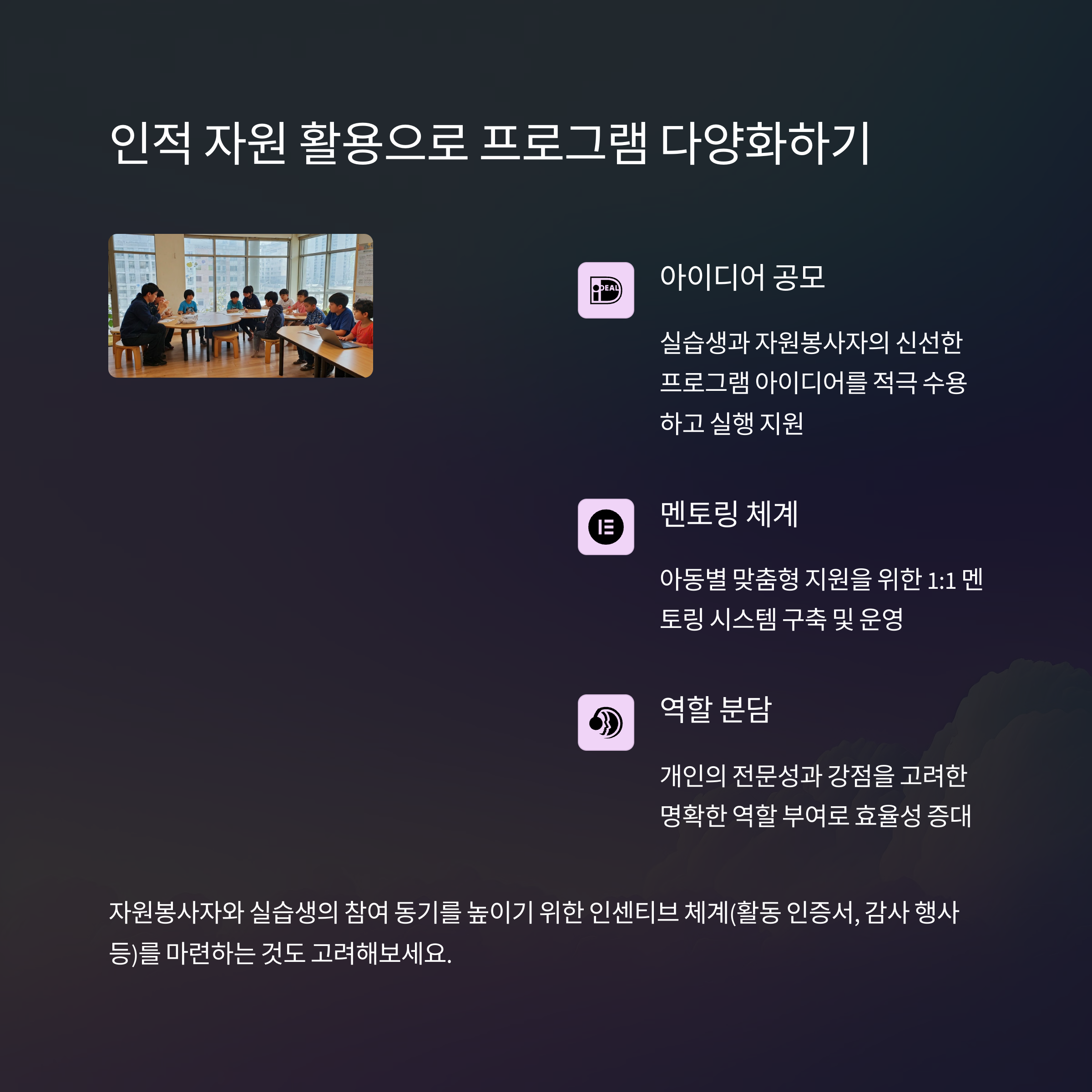 프로그램 참여율 제고를 위해 자원봉사자의 섬세한 관리가 요구되며, 정기적인 피드백과 사후 평가를 통해 업무 만족도를 높여야 합니다.