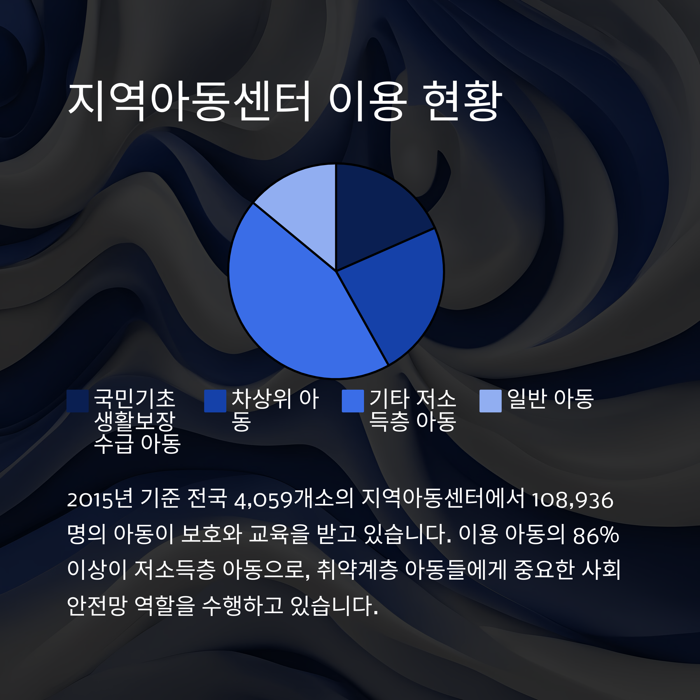 같은 해 이용 아동 수는 약 108,936명으로, 이 중 86% 이상이 저소득층 가정 출신입니다.