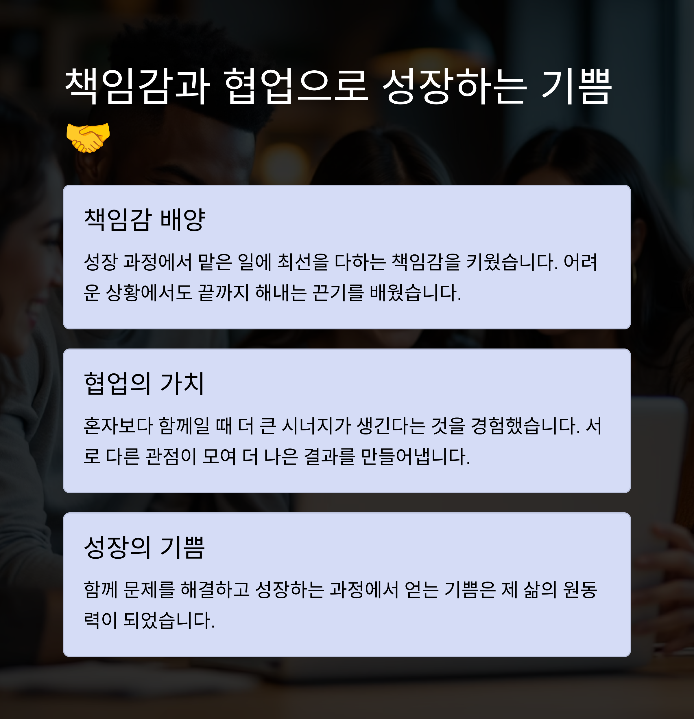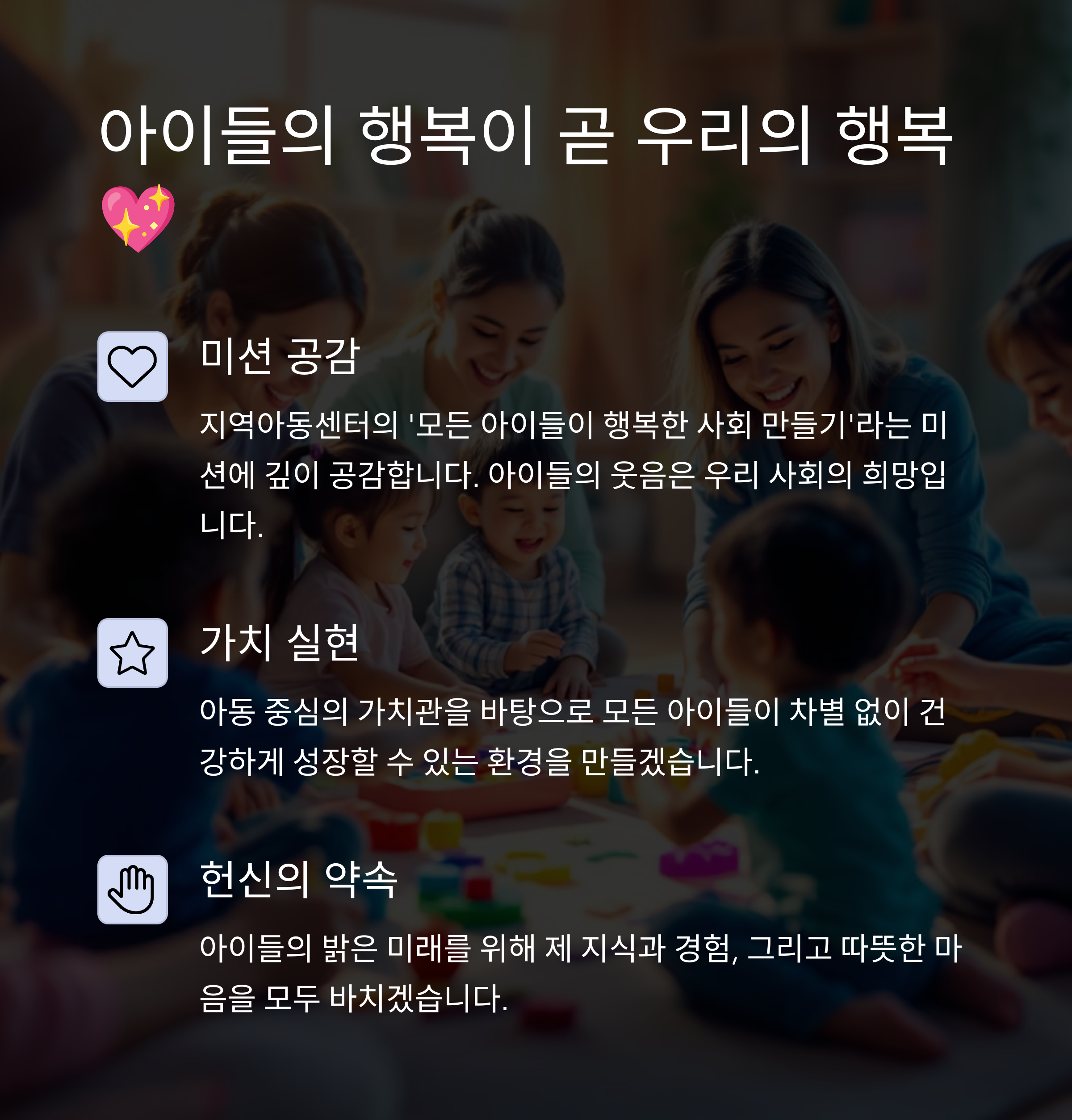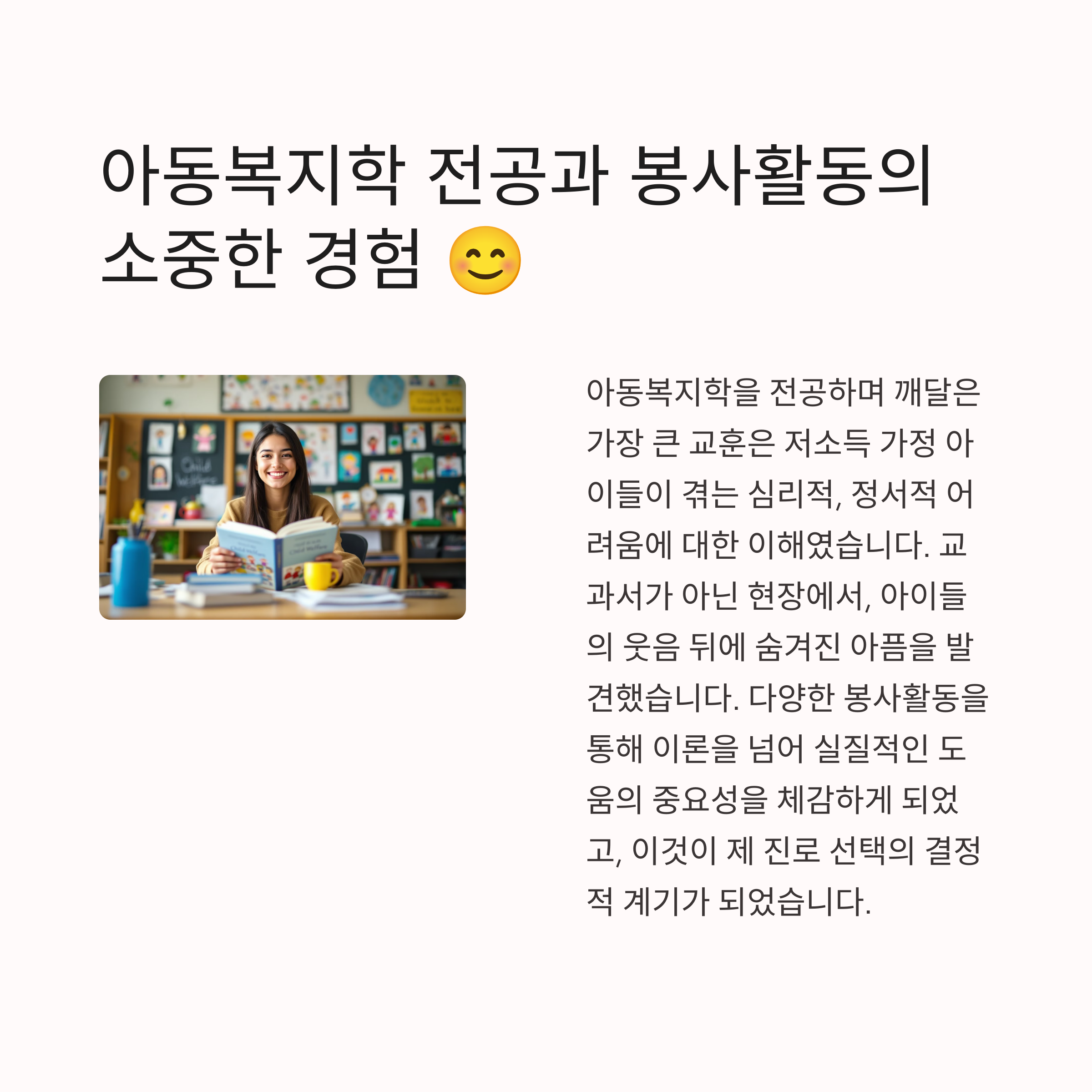 저는 대학 시절 아동복지학을 전공하며 학교와 지역사회를 잇는 다양한 프로그램에 참여해 본 경험이 있습니다.