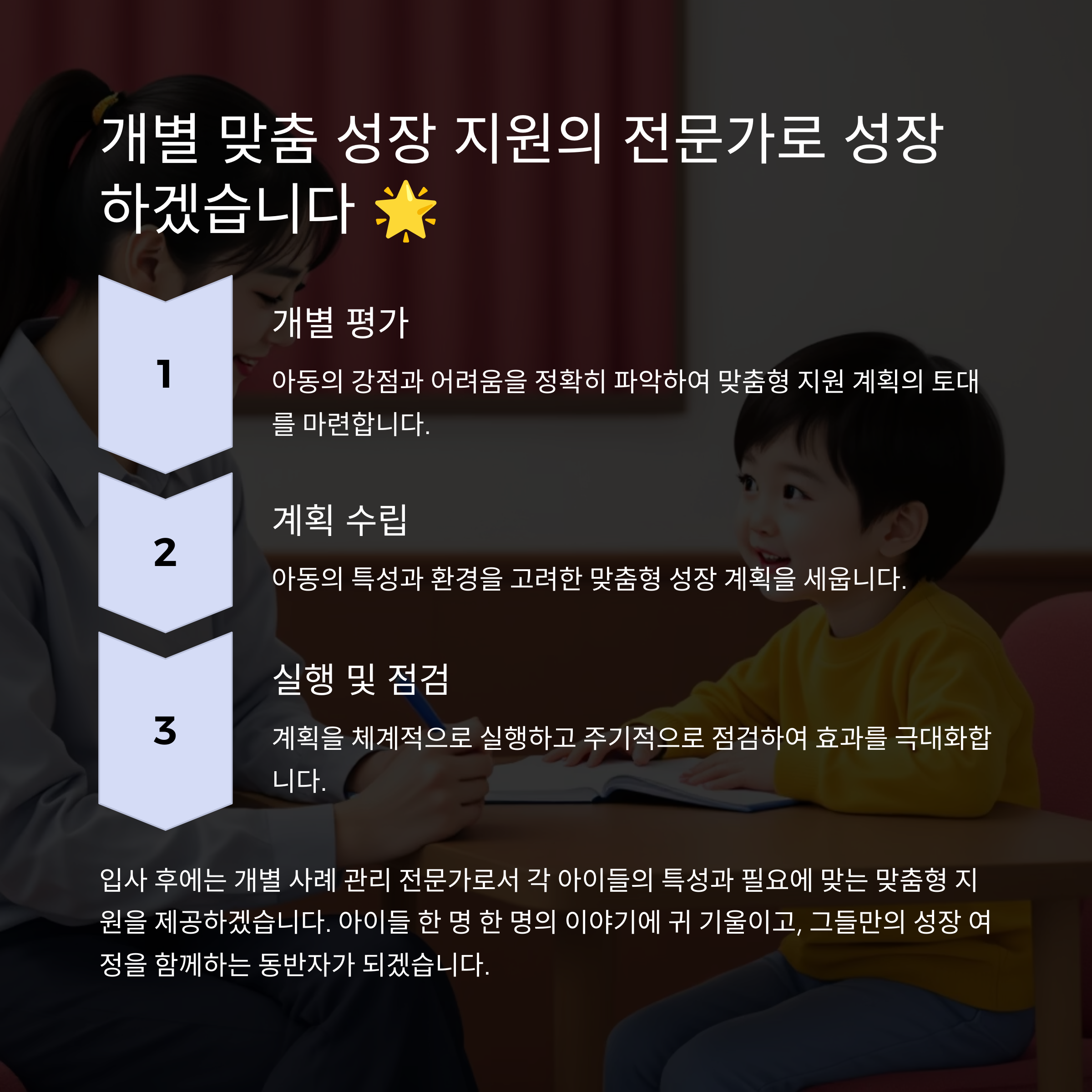 저의 목표는 지역아동센터와 같은 기관에서 실질적으로 도움을 줄 수 있는 전문성을 키우는 것입니다.