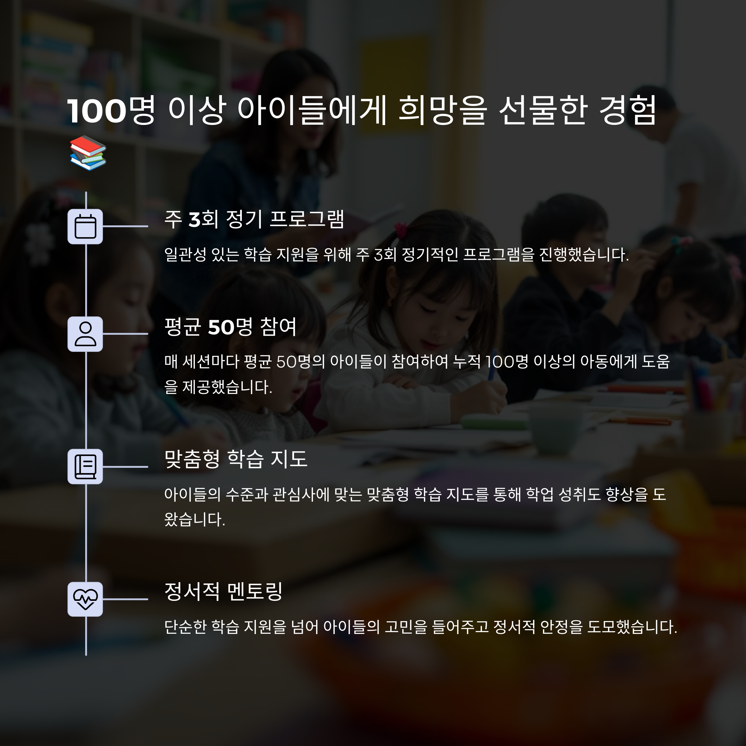 특히, 주 3회 지역 초등학교와 협력하여 방과 후 학습 지원 프로그램을 운영하며 직접 아동들과 소통하는 시간을 가졌습니다.