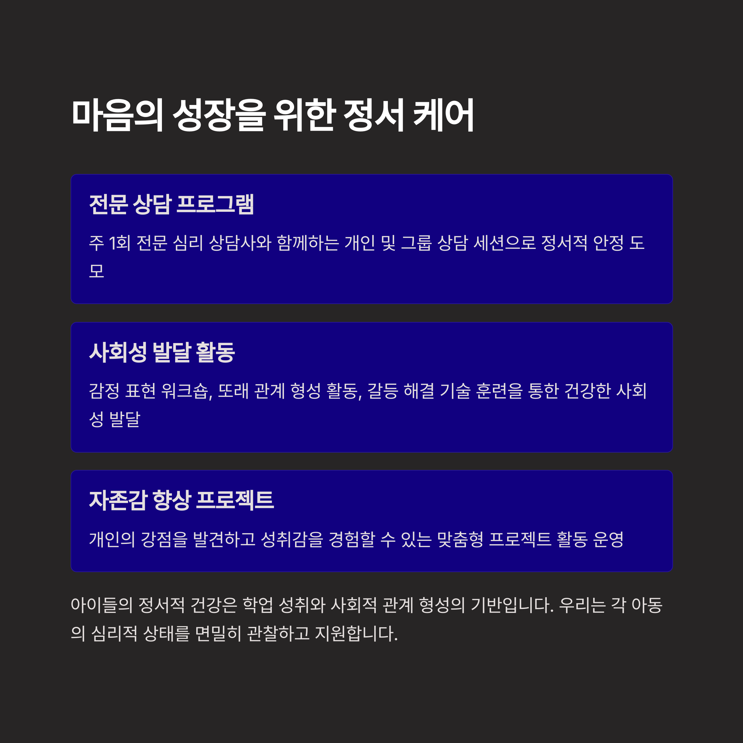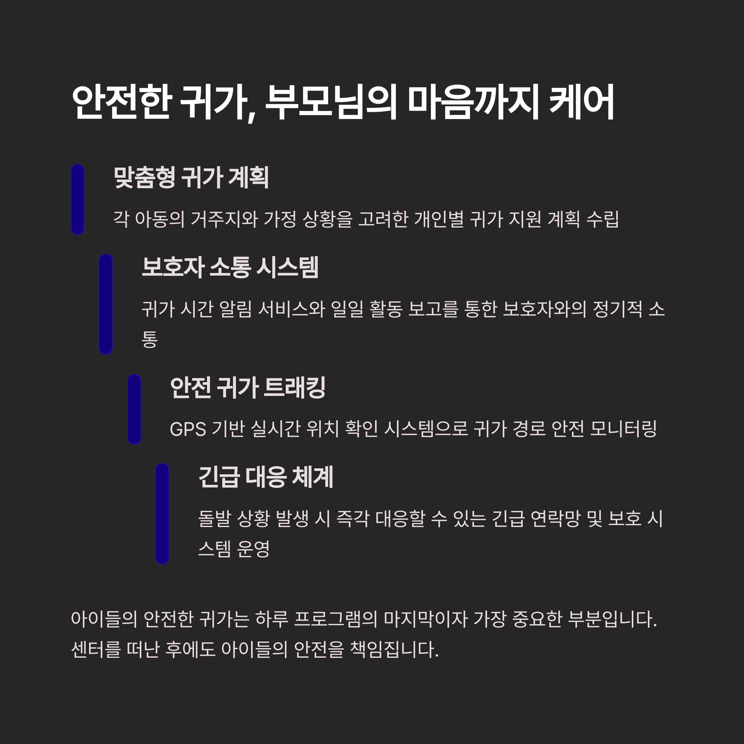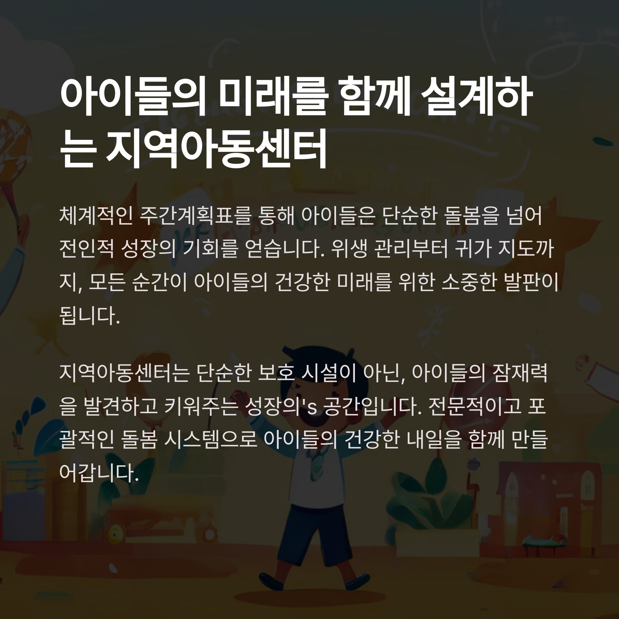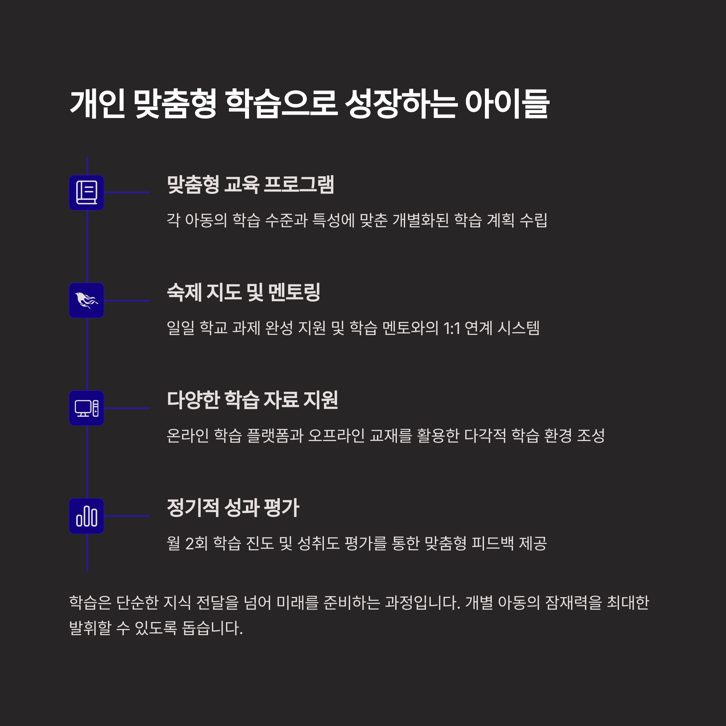 변화하는 아동의 욕구에 맞춰 지속적으로 계획표를 점검하고 발전시킨다면, 그 효과는 더욱 커질 것입니다. 아이들의 밝은 미래를 위한 첫걸음은 체계적인 오늘로부터 시작됩니다.