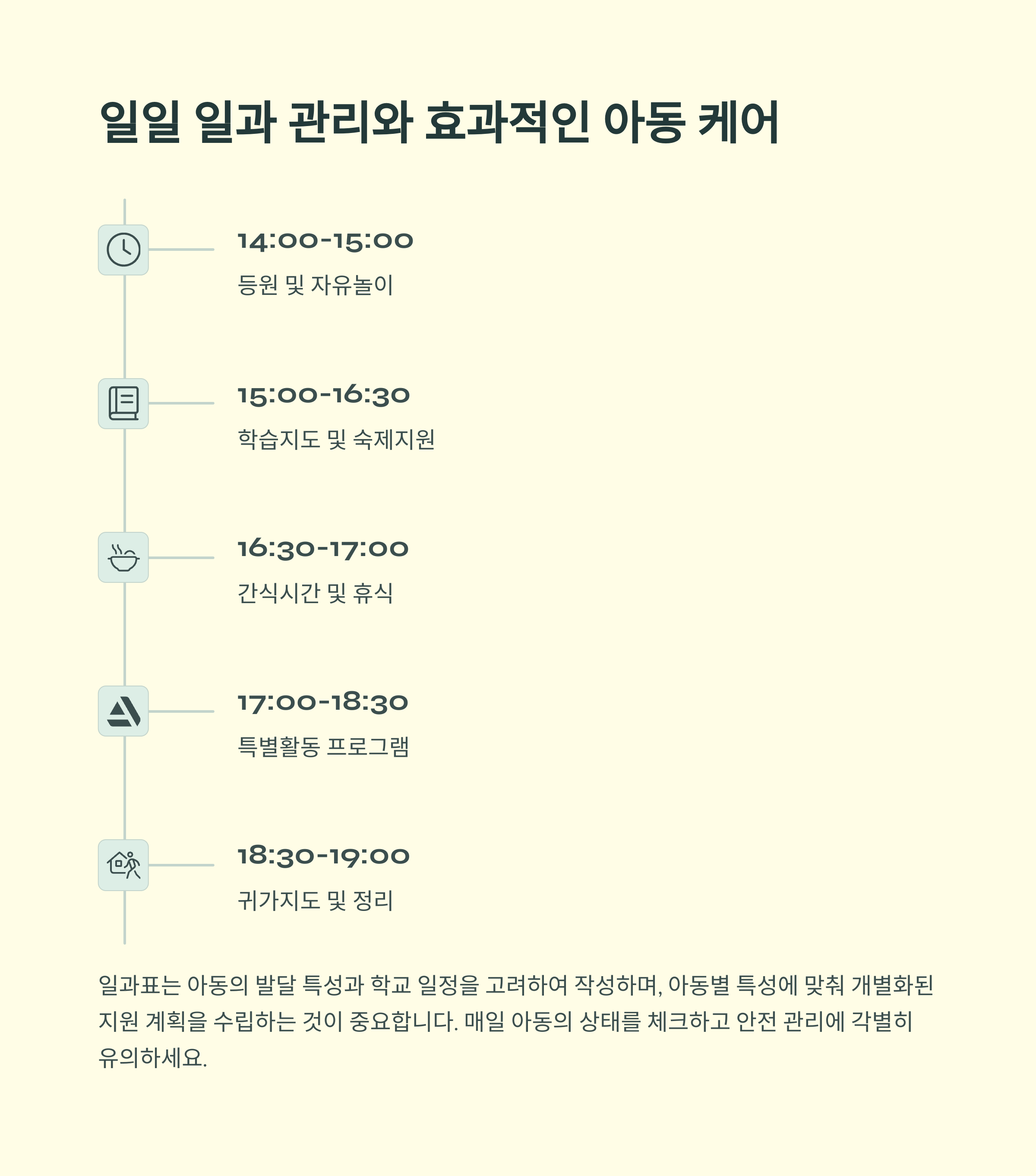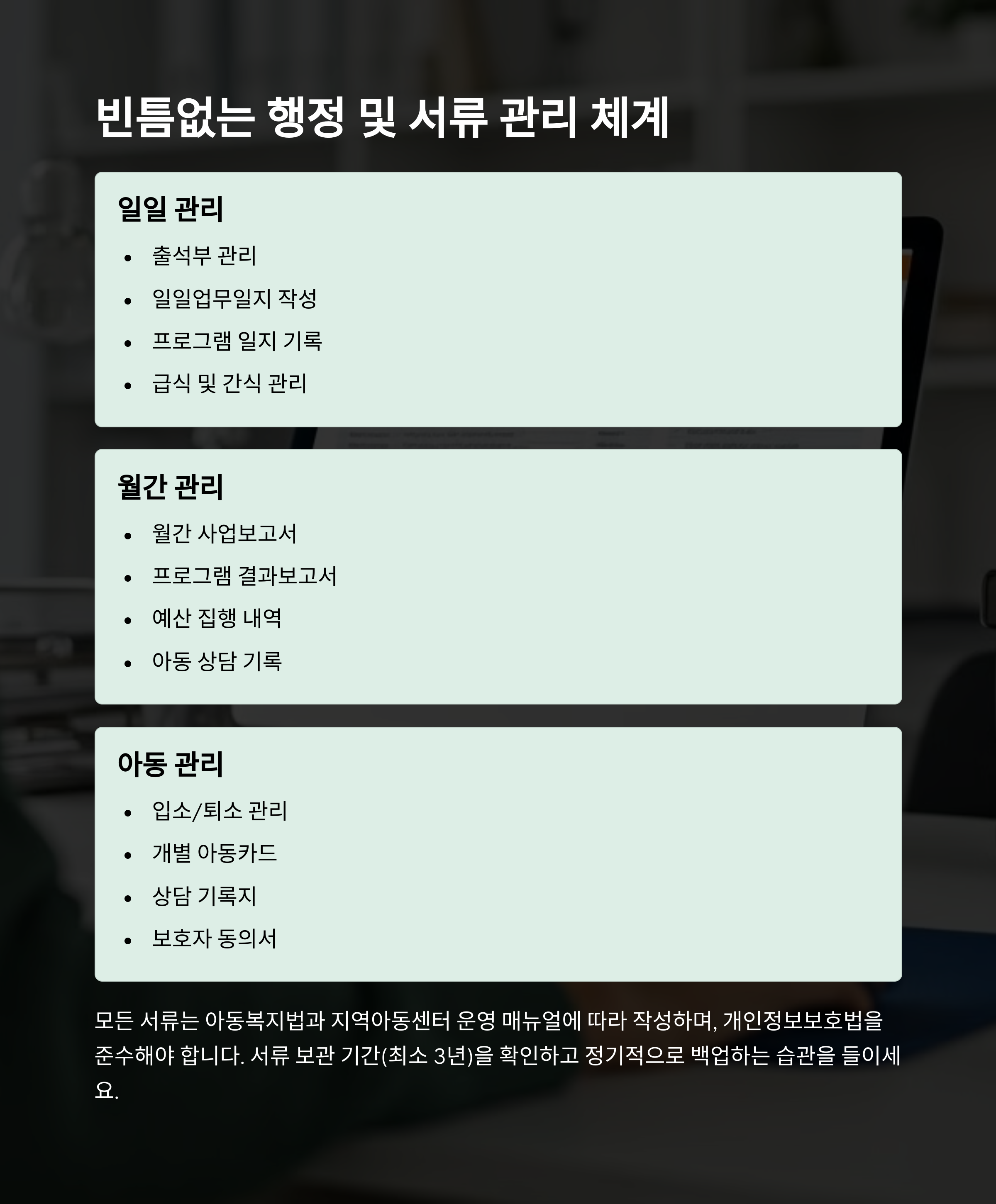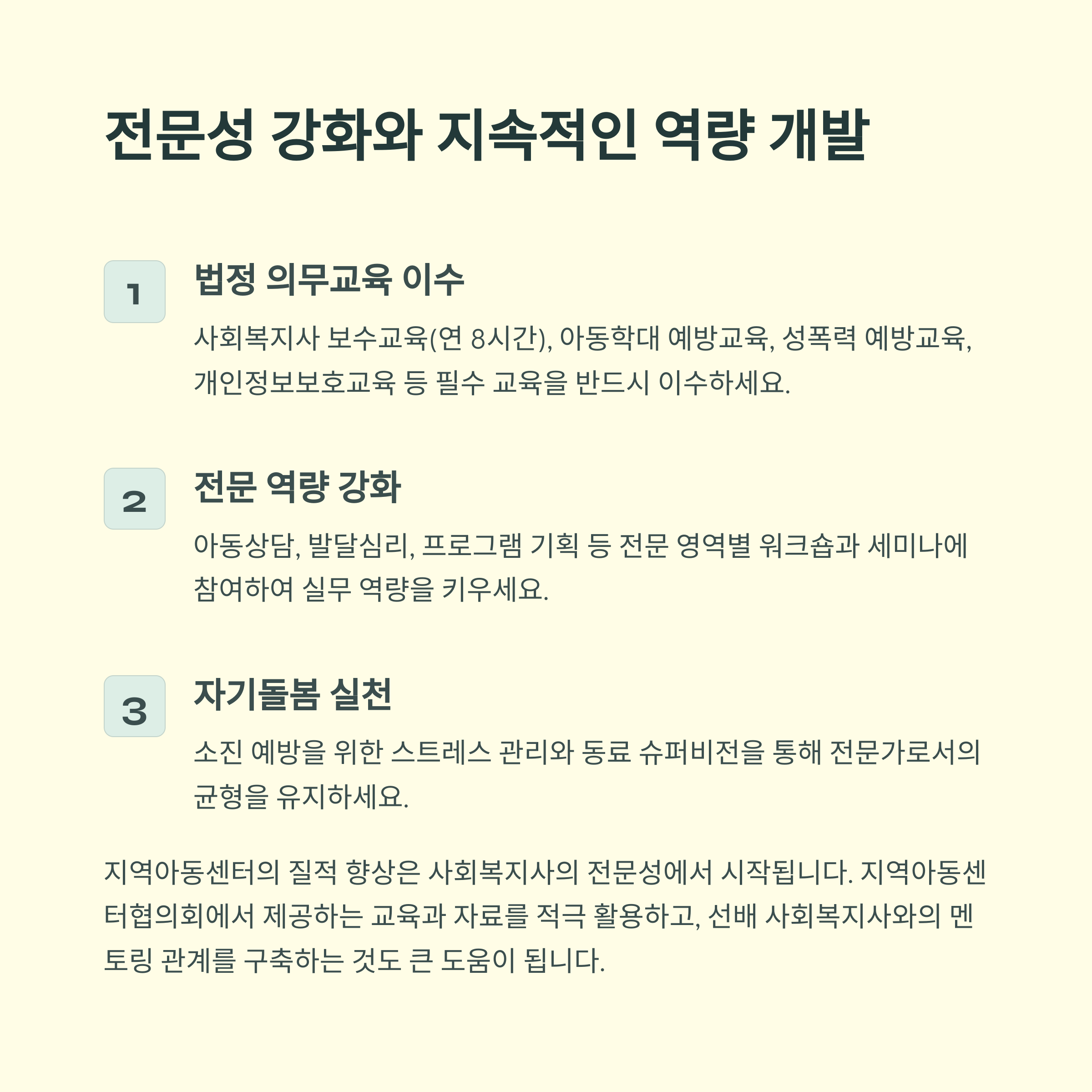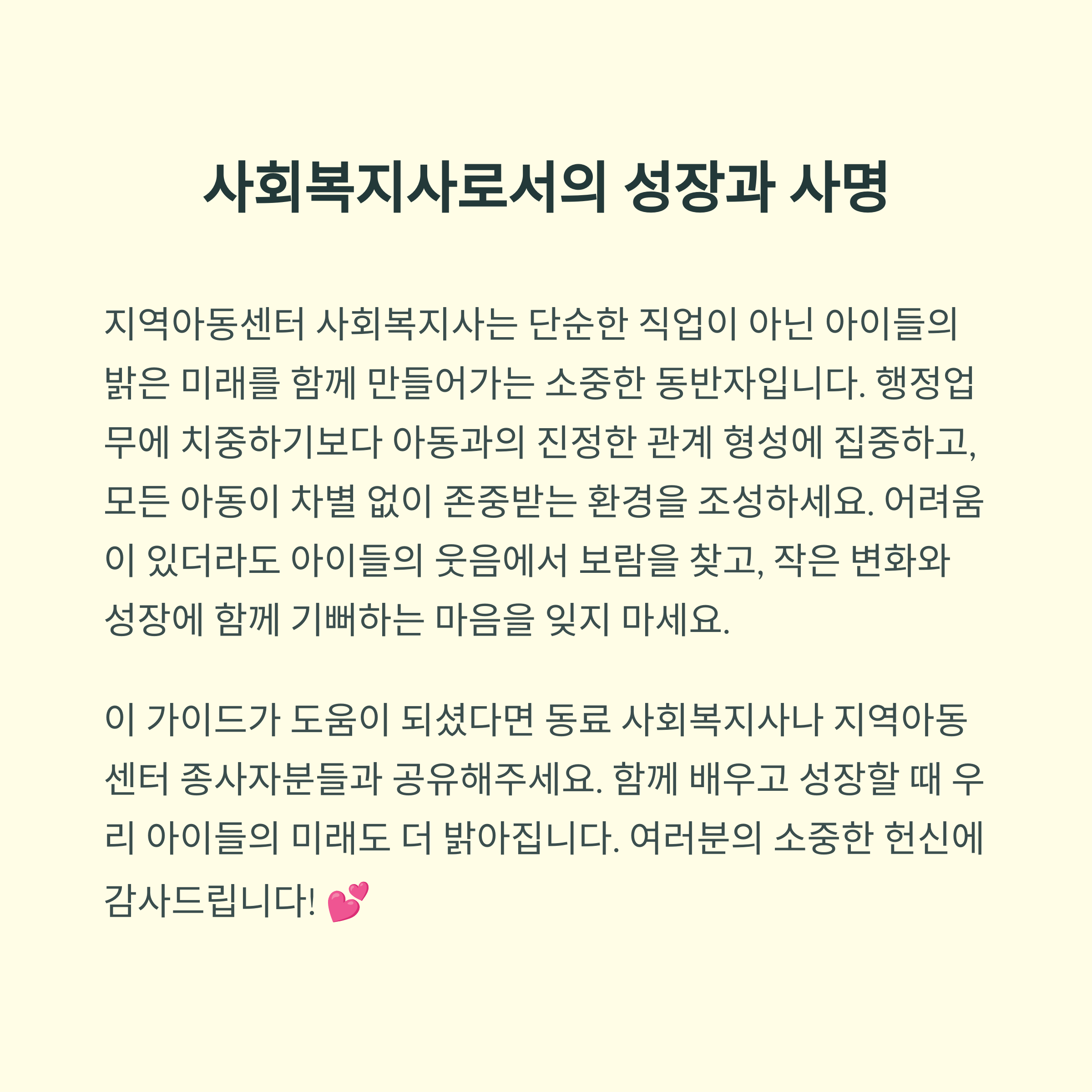 지역아동센터에서의 사회복지사 역할은 아이들의 삶에 깊은 영향을 미치며, 전문성과 책임감을 동시에 요구합니다. 이번 가이드를 통해 실무 프로세스를 이해하고, 법적 기준 및 서류 작성 요령을 익히며 업무에 대한 자신감을 갖게 되길 바랍니다. 특히 실습생이나 신입 직원들에게 도움이 되길 바라며 매일 반복되는 일과 속에서도 아동의 변화를 체감하며 의미 있는 하루를 만들어가시길 응원합니다.