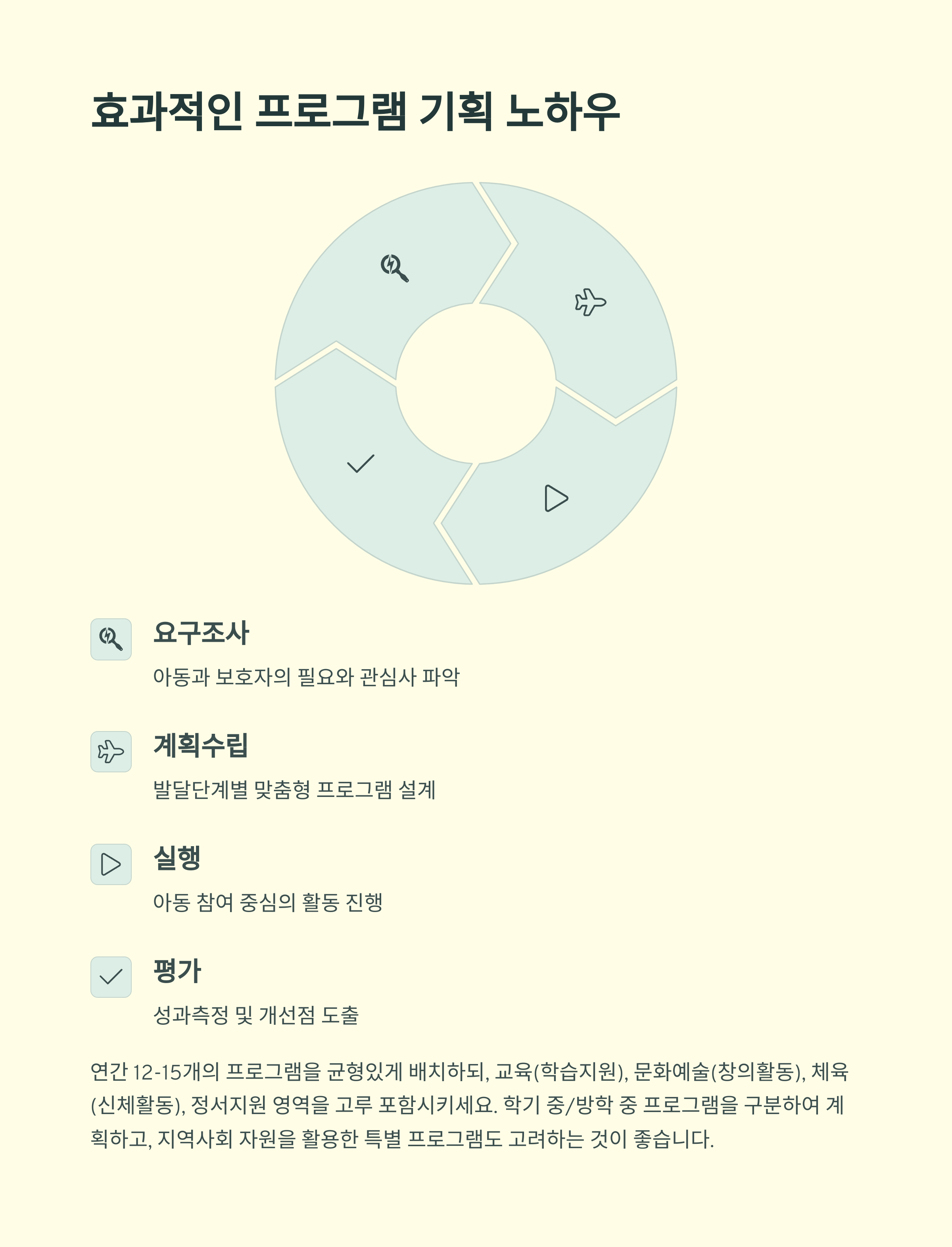 | 1:1 상담, 정기적 교류 필요 | 자원 연계와 강사 스케줄 조율 필수 | 연 4~6회 외부 계획서 제출 |