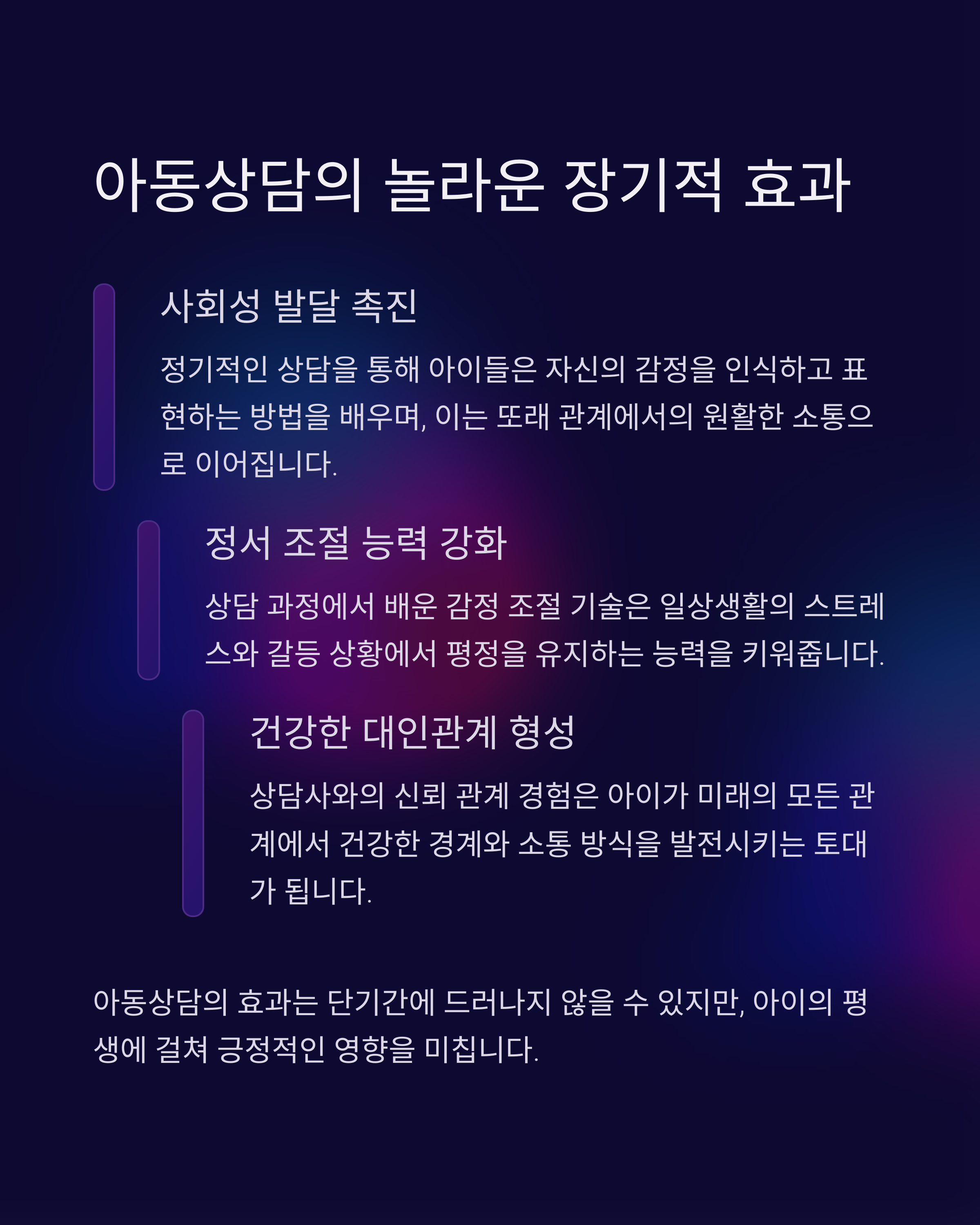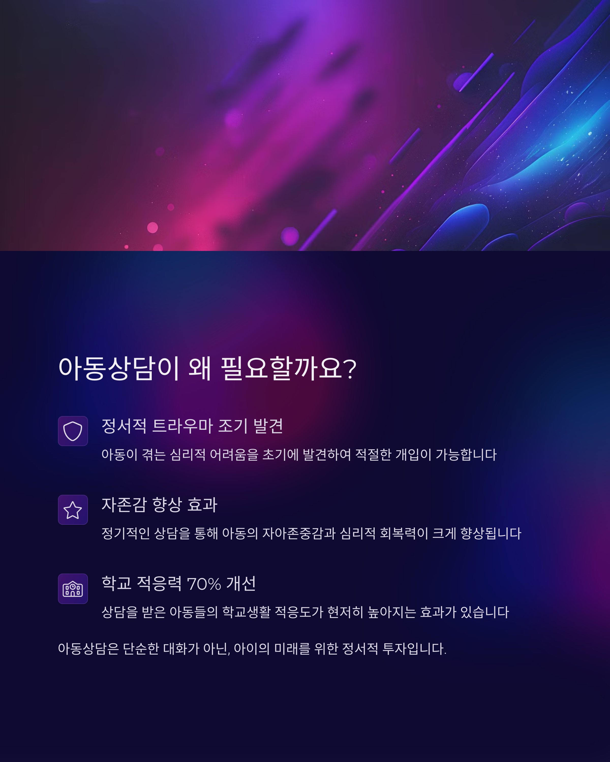 | 아동상담 중요성 | 정서적 지원과 자기표현 능력 향상에 기여 |