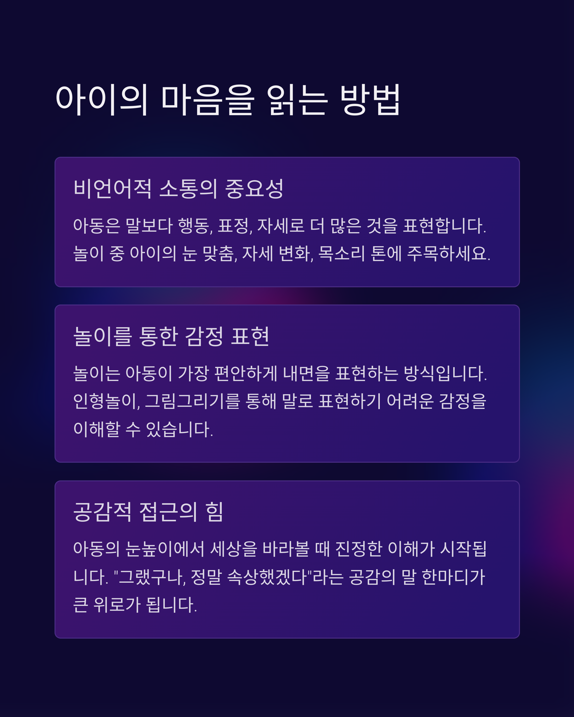 | 아동의 감정을 이해하고 행동을 조절할 수 있도록 도와주는 전문 상담 | 실제 상황에서 활용할 수 있는 상담자와 아동 간의 대화 흐름 예시 | 게임, 그림, 감정카드 등을 통해 아동의 표현을 자연스럽게 이끌어내는 방법 |
