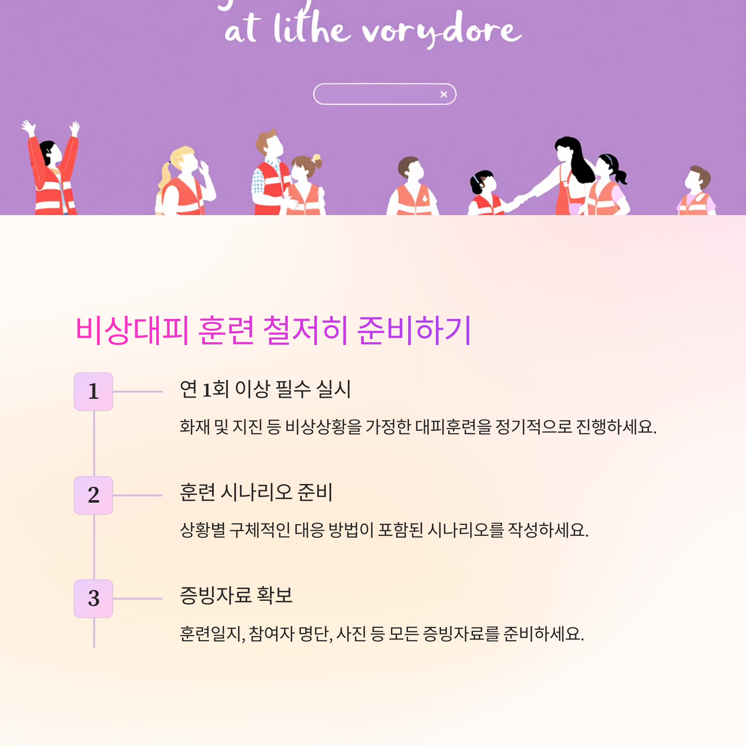 연 1회 이상 화재 및 지진 등 비상상황을 가정한 대피훈련을 실시해야 합니다.