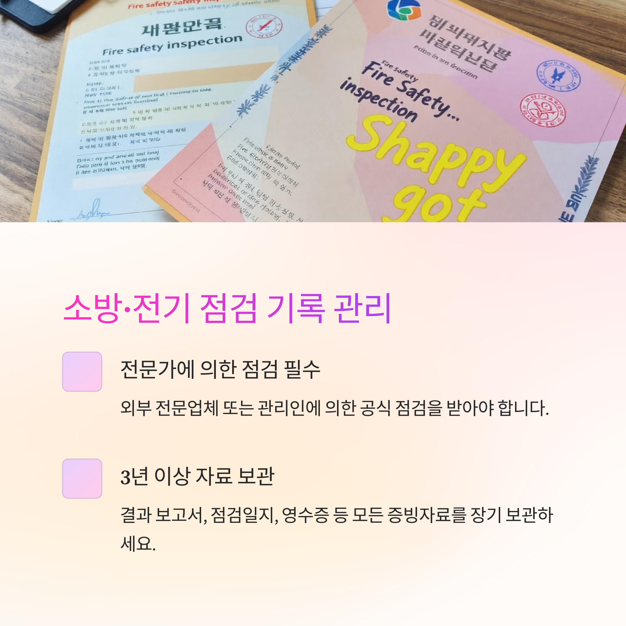 전기 및 소방시설 점검은 외부 전문업체 또는 관리인에 의해
