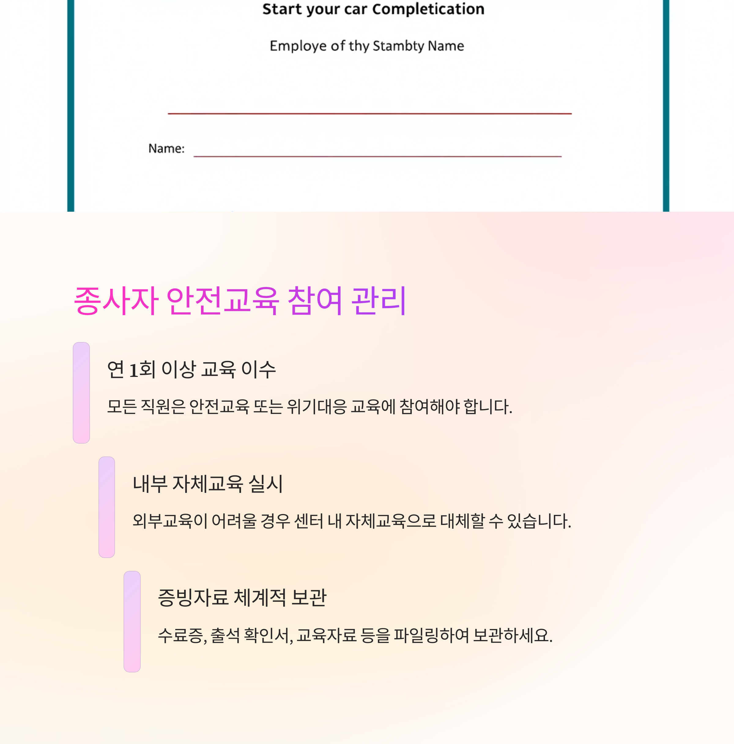 참여해야 하며, 관련 수료증, 출석 확인서, 내부 자체교육 자료 등을