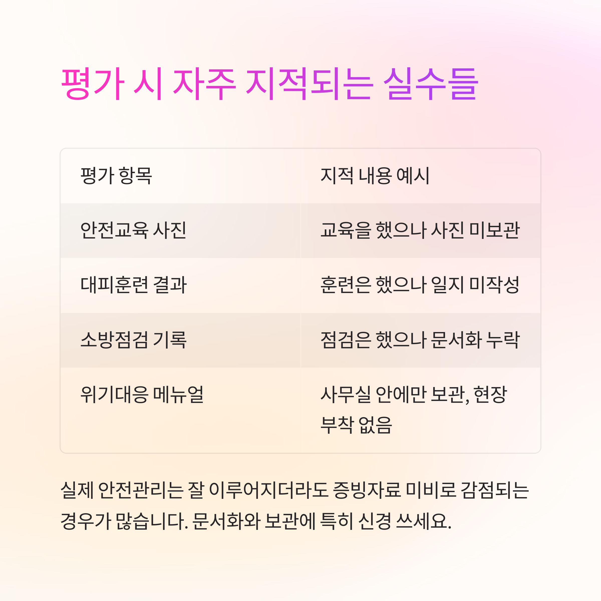| 소방점검 기록 누락 | 점검은 했으나 문서화 누락 |