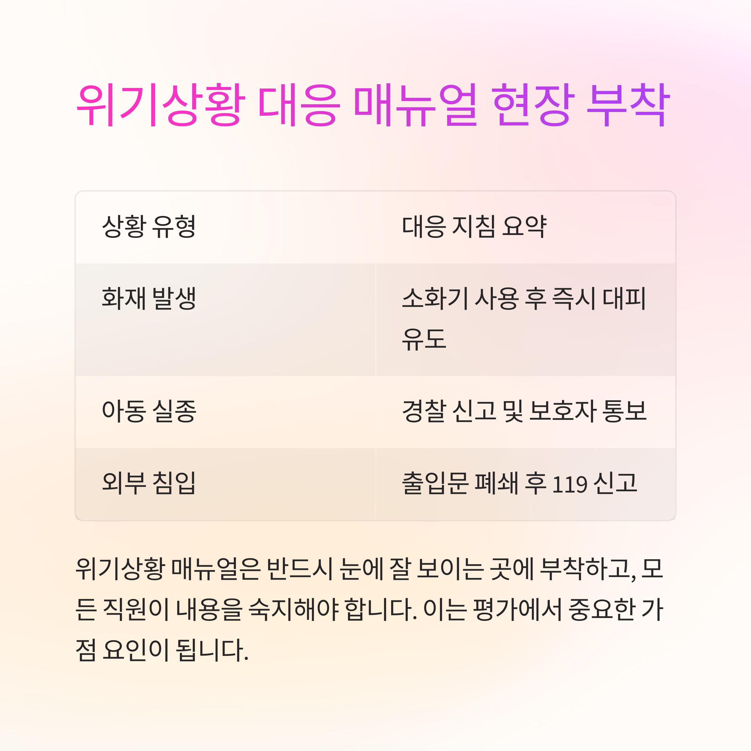 | 위기대응 메뉴얼 미부착 | 사무실 안에만 보관, 현장 부착 없음 |