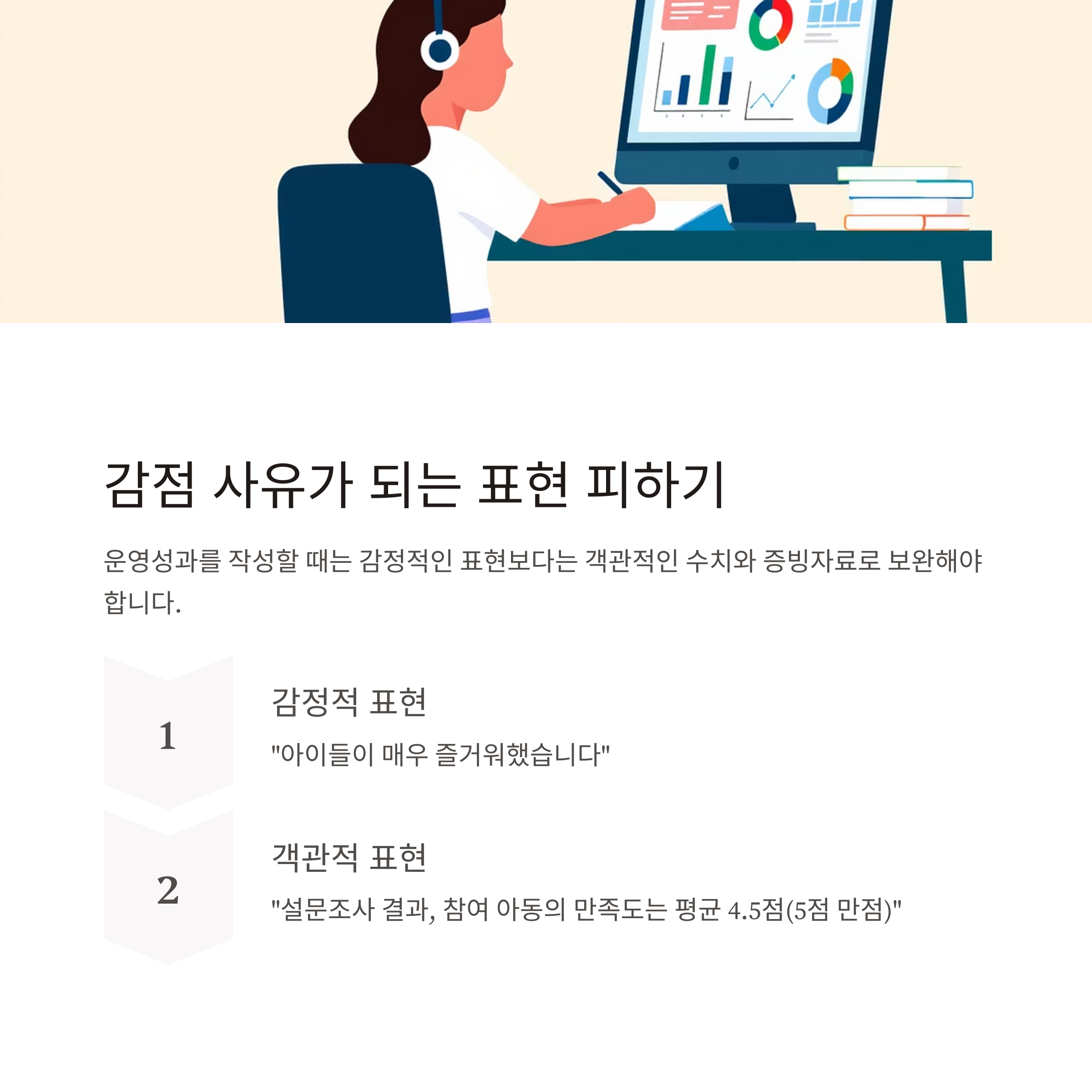 운영성과를 작성할 때는 감정적인 표현보다는 객관적인 수치와 증빙자료로 보완해야 합니다.