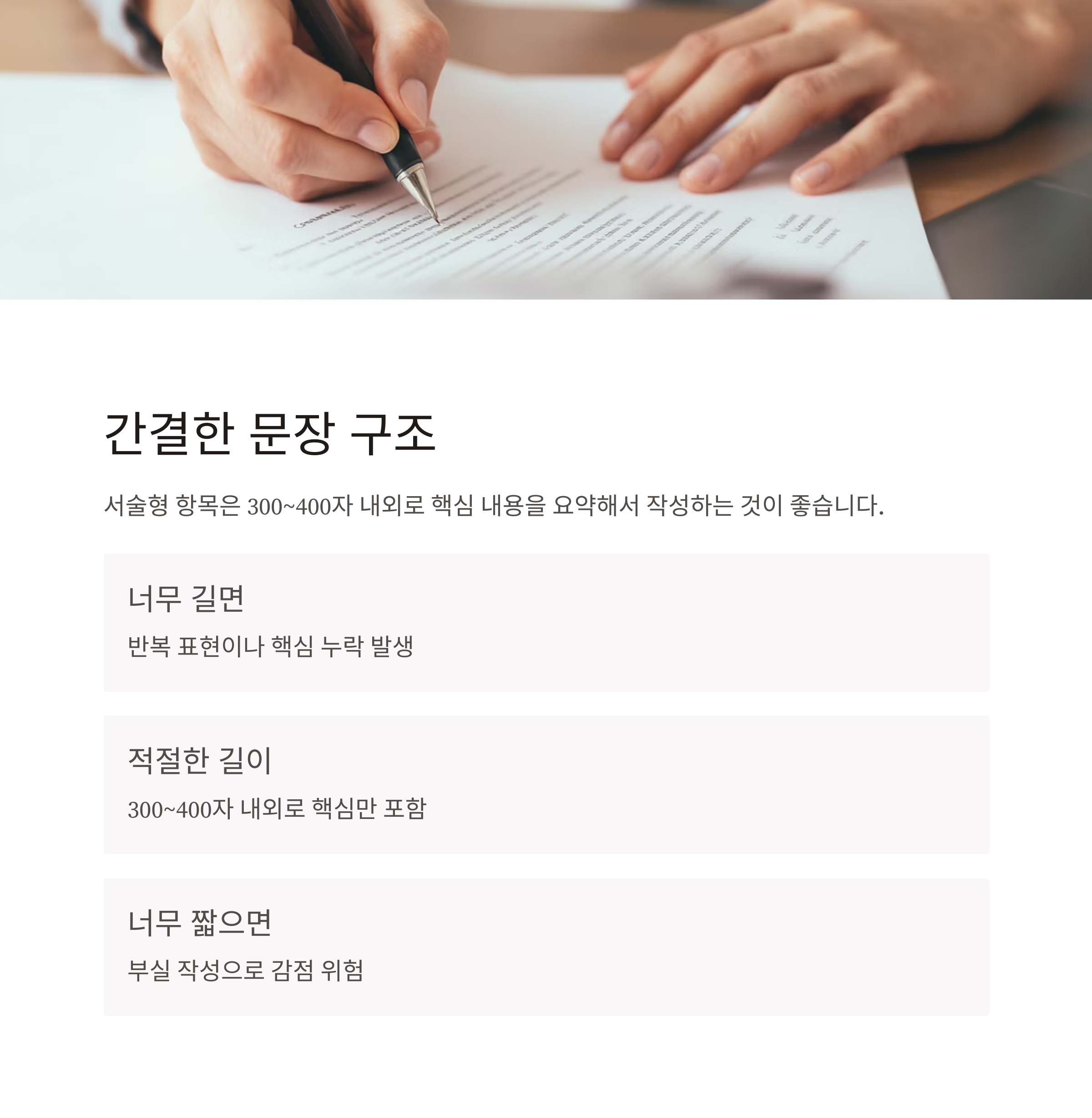 불필요한 수식은 줄이고, 실무자가 보는 관점에서 명확하게 작성해야 감점을 피할 수 있습니다.