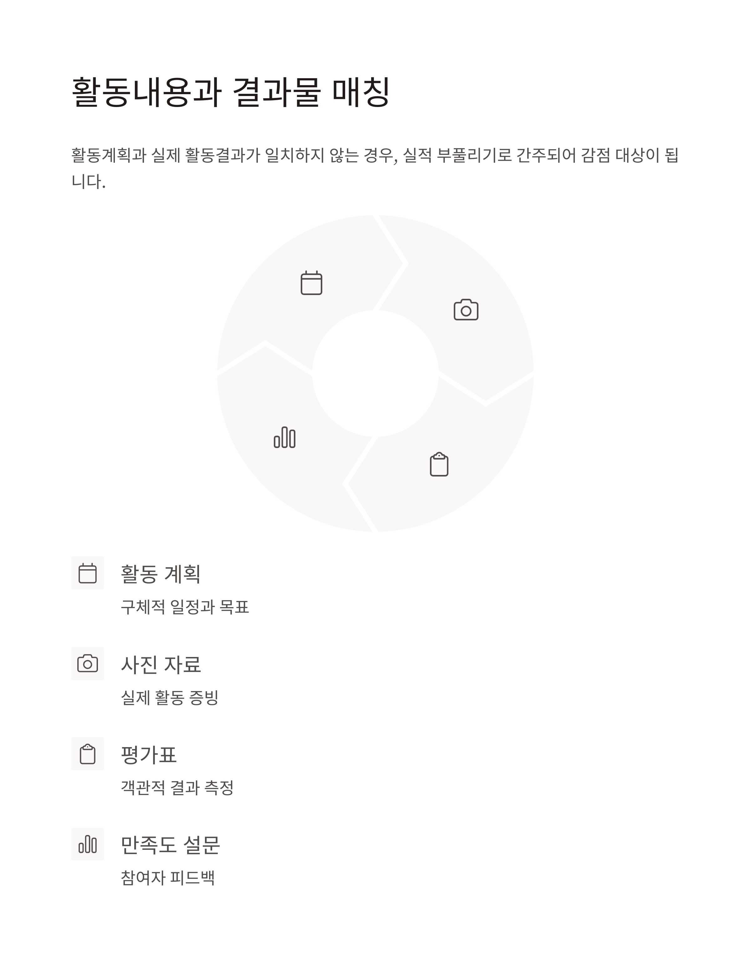 사진자료, 일지, 평가표, 만족도 설문 등 결과물과의 매칭이 중요하며