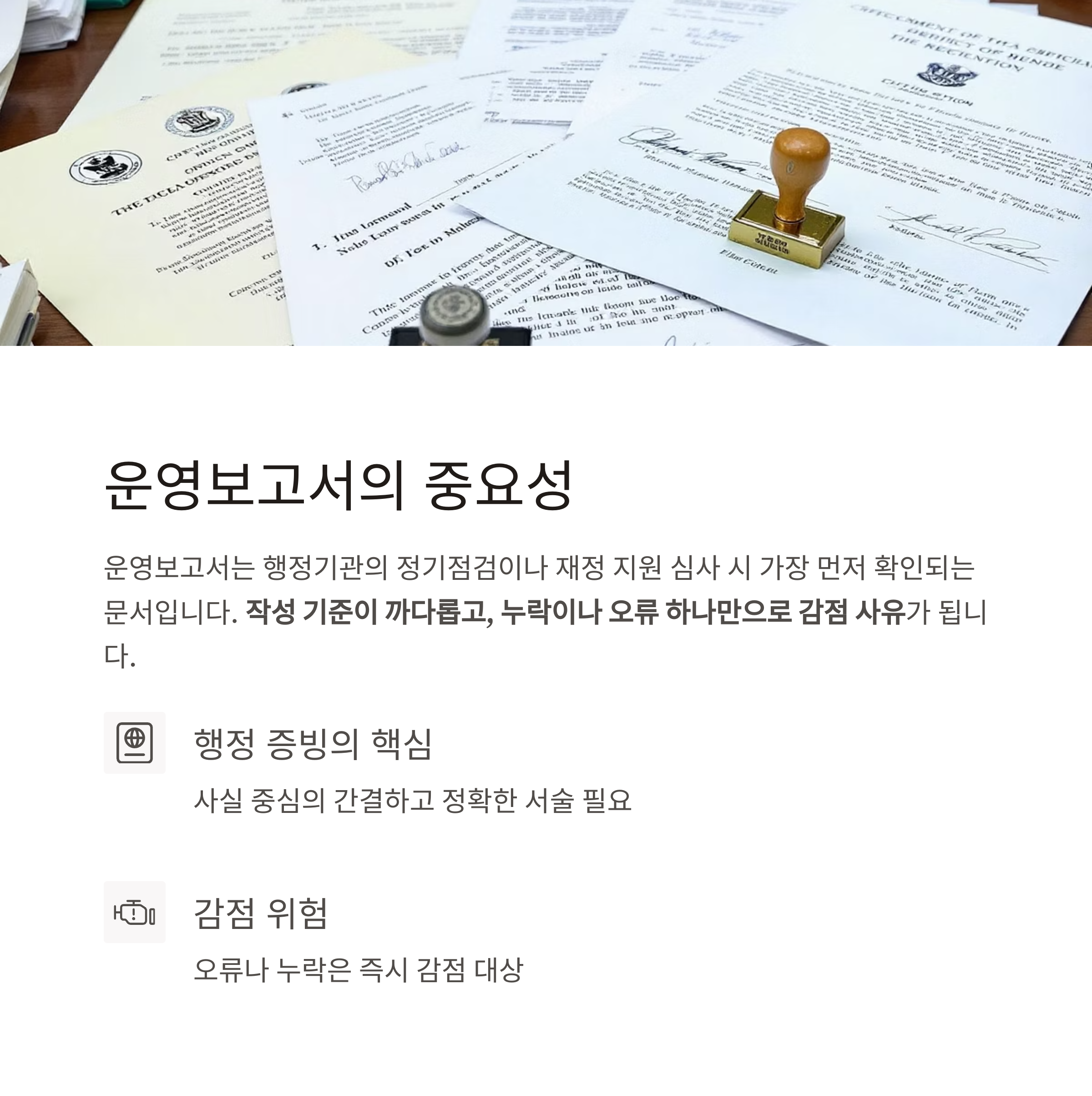 운영보고서는 행정기관의 정기점검이나 재정 지원 심사 시 가장 먼저 확인되는 문서입니다.