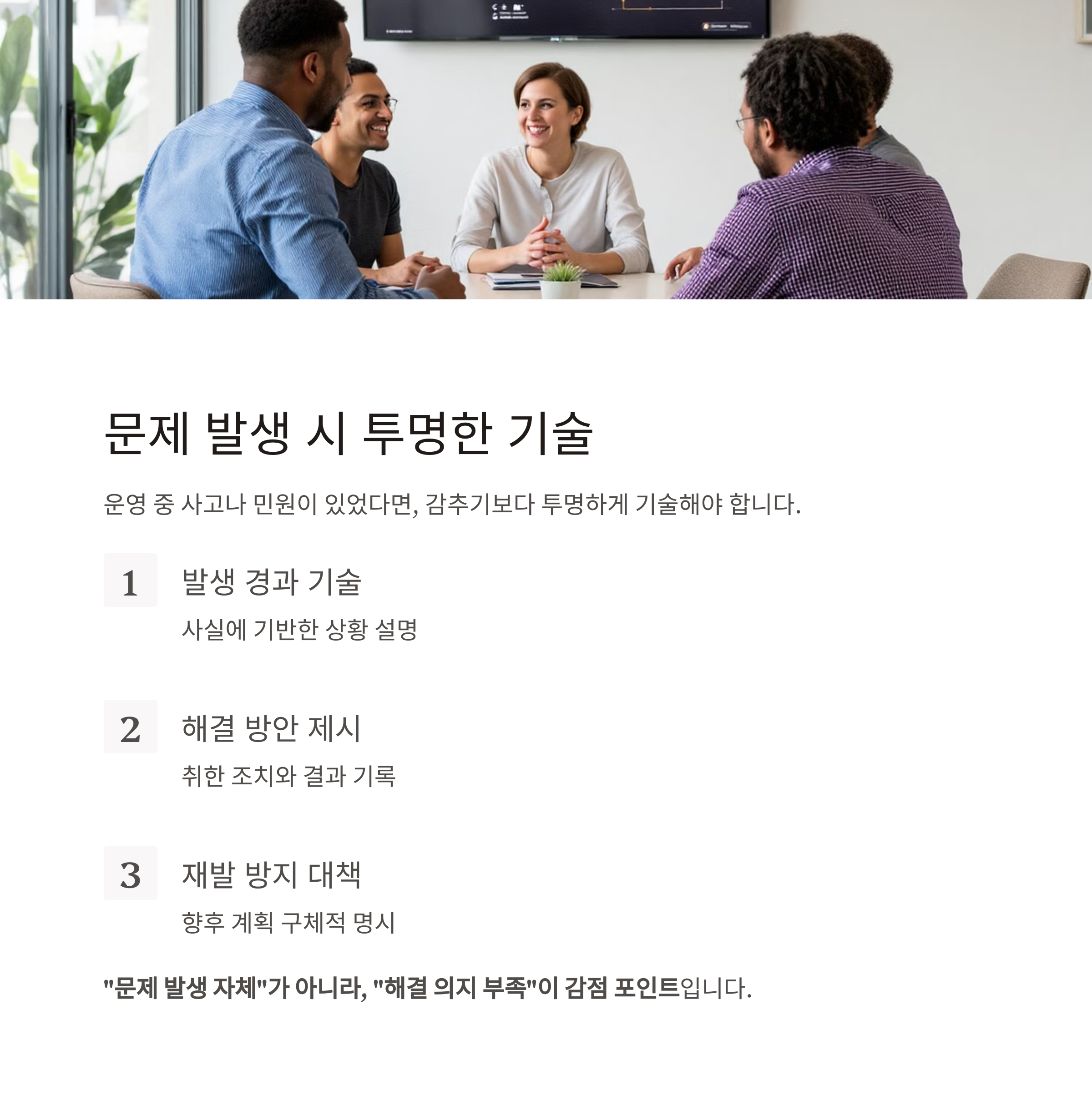 운영 중 사고나 민원이 있었다면, 감추기보다 투명하게 기술해야 평가에서 감점이 없습니다.