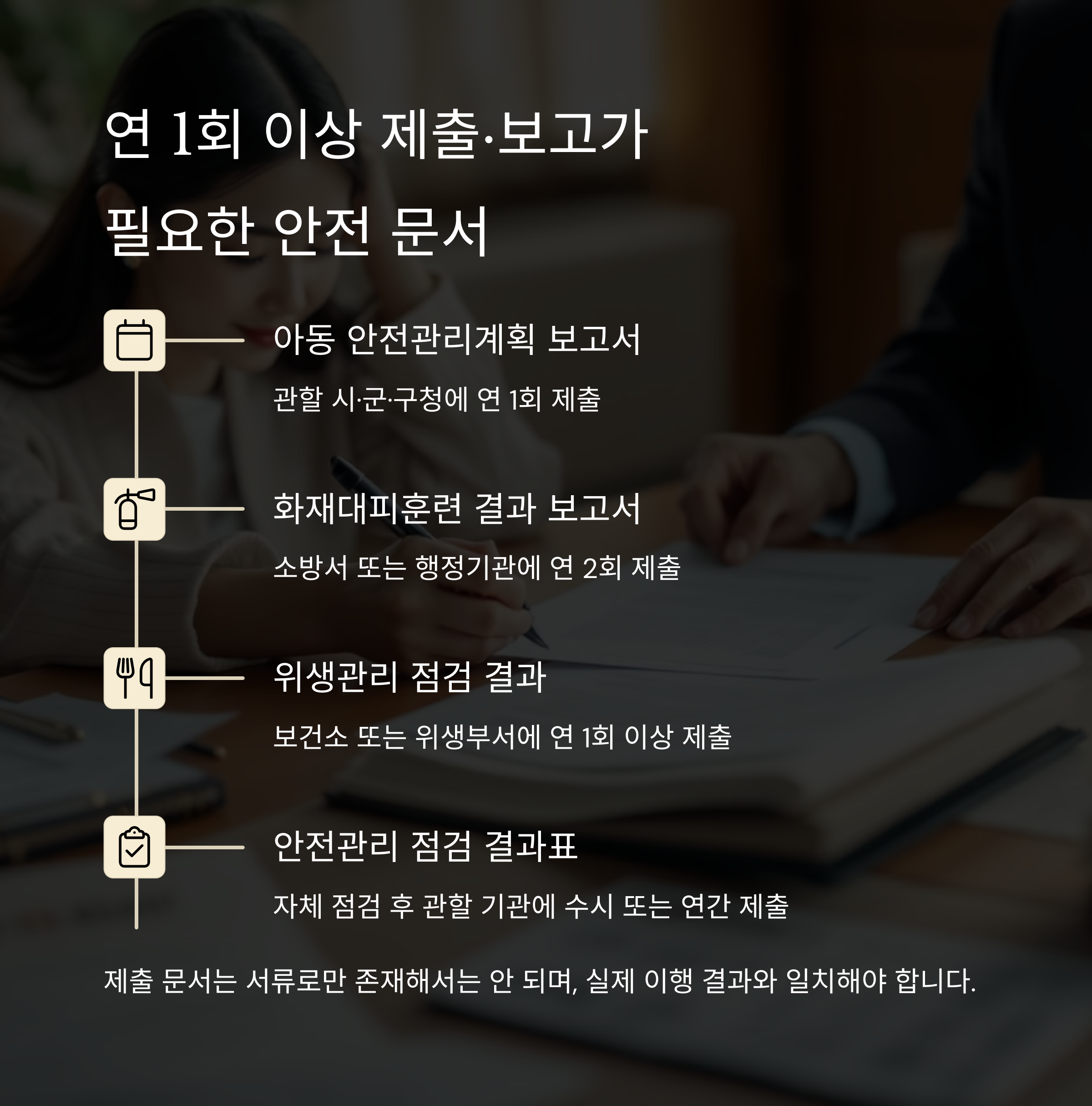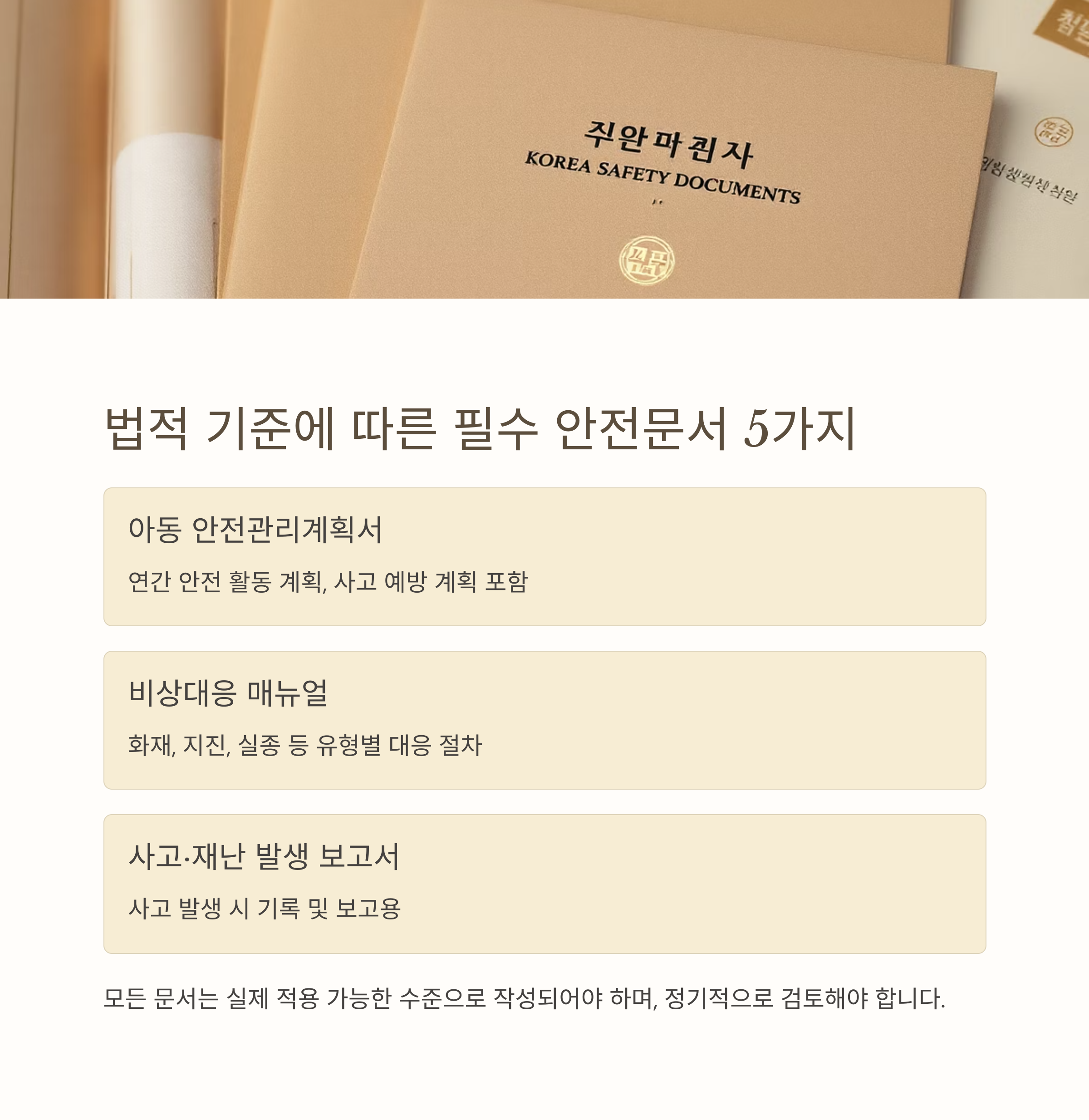 이에 따라 아동의 생명과 신체를 보호하기 위한 안전관리 문서는 필수적으로 갖추어야 합니다.