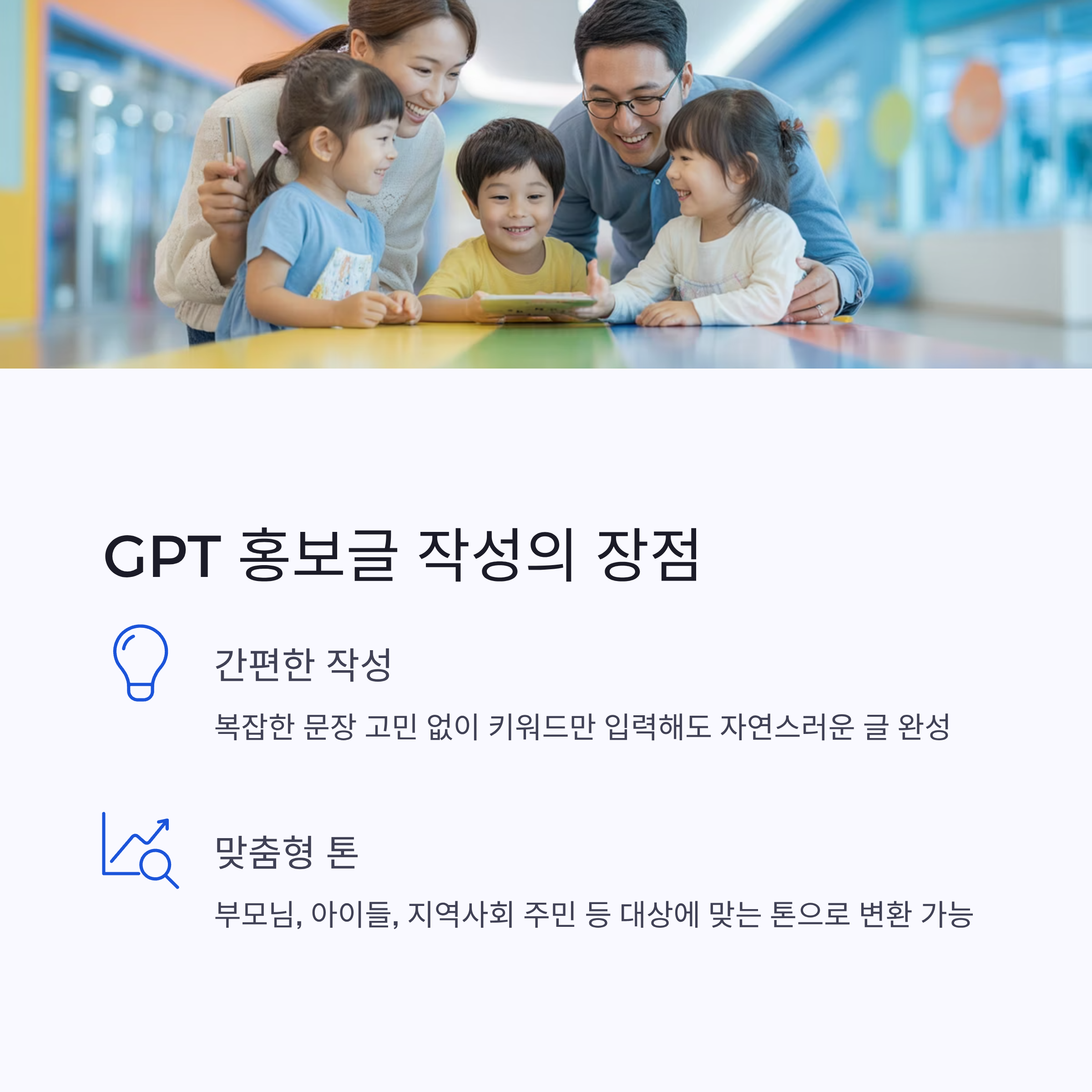 또한 부모님, 아이들, 지역사회 주민 등 대상에 맞는 톤으로 변환이 가능해 더욱 효과적인 홍보가 됩니다.