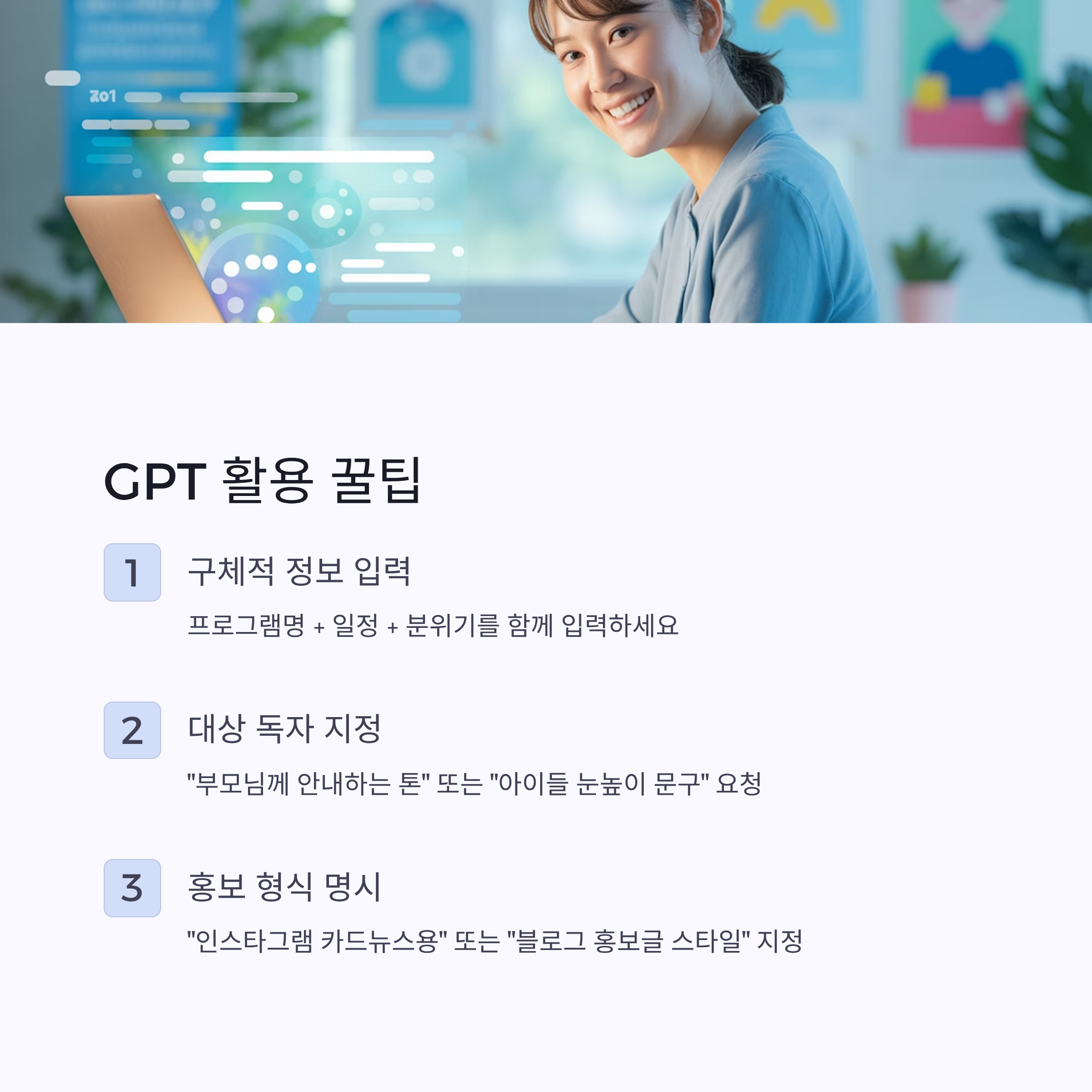 예: “부모님께 안내하는 톤” 또는 “아이들 눈높이에 맞는 문구” - 홍보 형식을 요청하세요
